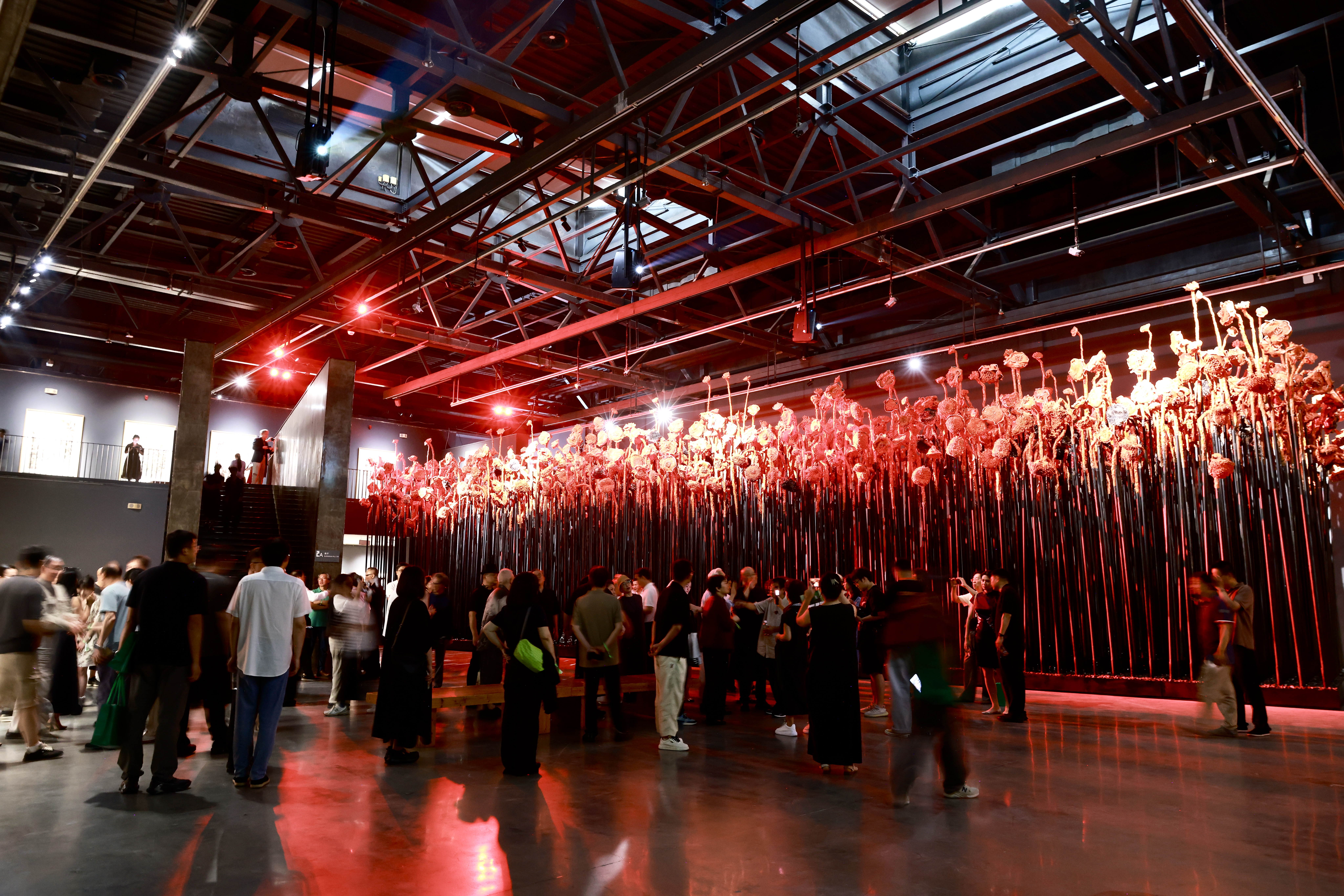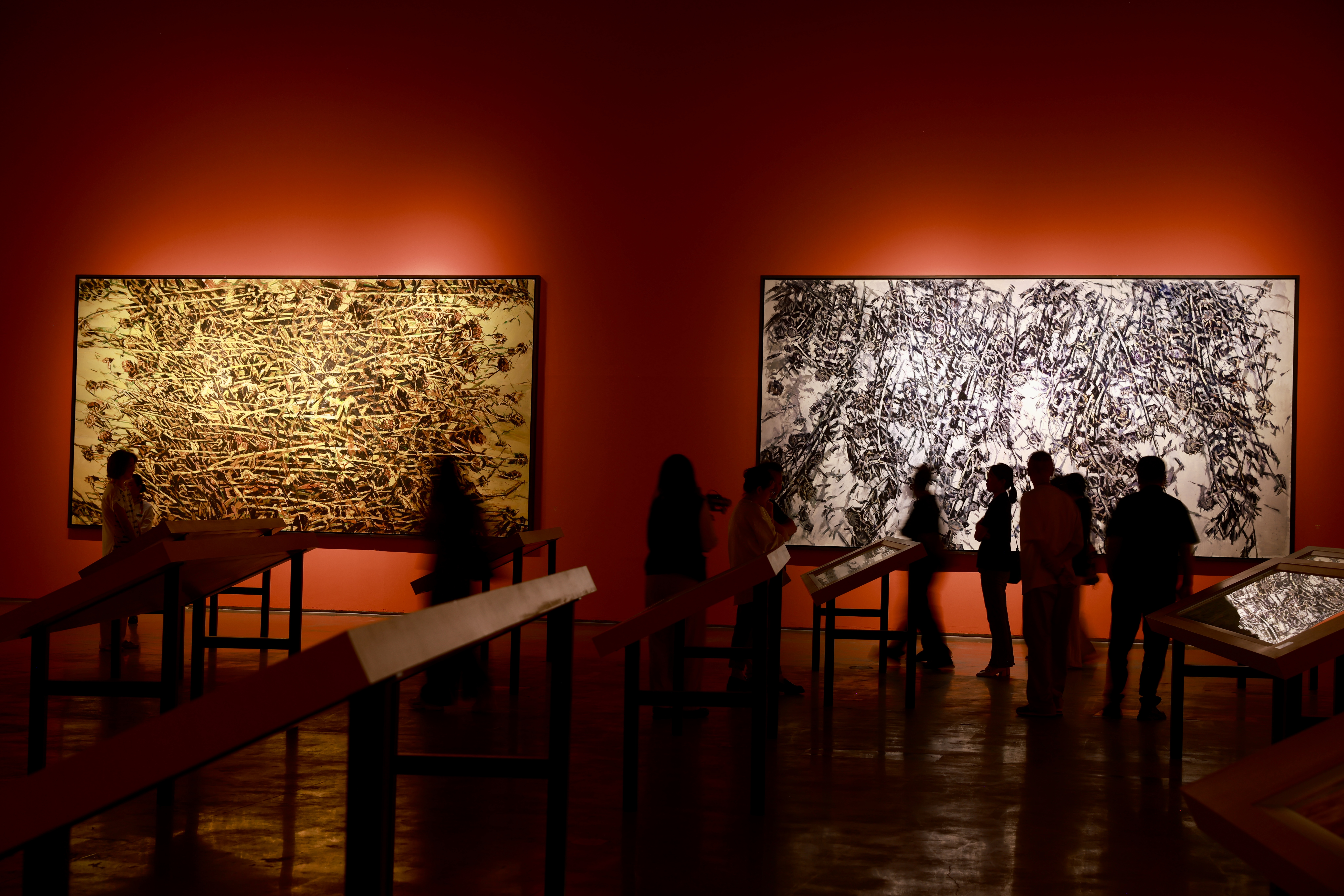 「共生」展廳內,三屏影像並置,交織成一道視覺史詩——銅錘擊打葵盤,星火飛濺如雨;萬葵逐日,又在秋風中垂首如鎏金。許江立於葵原,畫筆與葵葉同顫,在巨幅畫布上揮寫萬千葵姿。影像與雕塑群像共同構建了一個多重感知的現場:葵原的枯榮輪迴、金屬的千錘百鍊、藝術家的孤身行野,共生不再是生物學意義上的並存,而是升華為一種跨越物種、時空與媒介的生命哲學,共同詮釋着「共生」的深層內核:那是毀滅與新生的對話,是個體與時代的共鳴,亦是人文之山巍然矗立的精神見證,更是大地與命運間永恒的相互滋養。