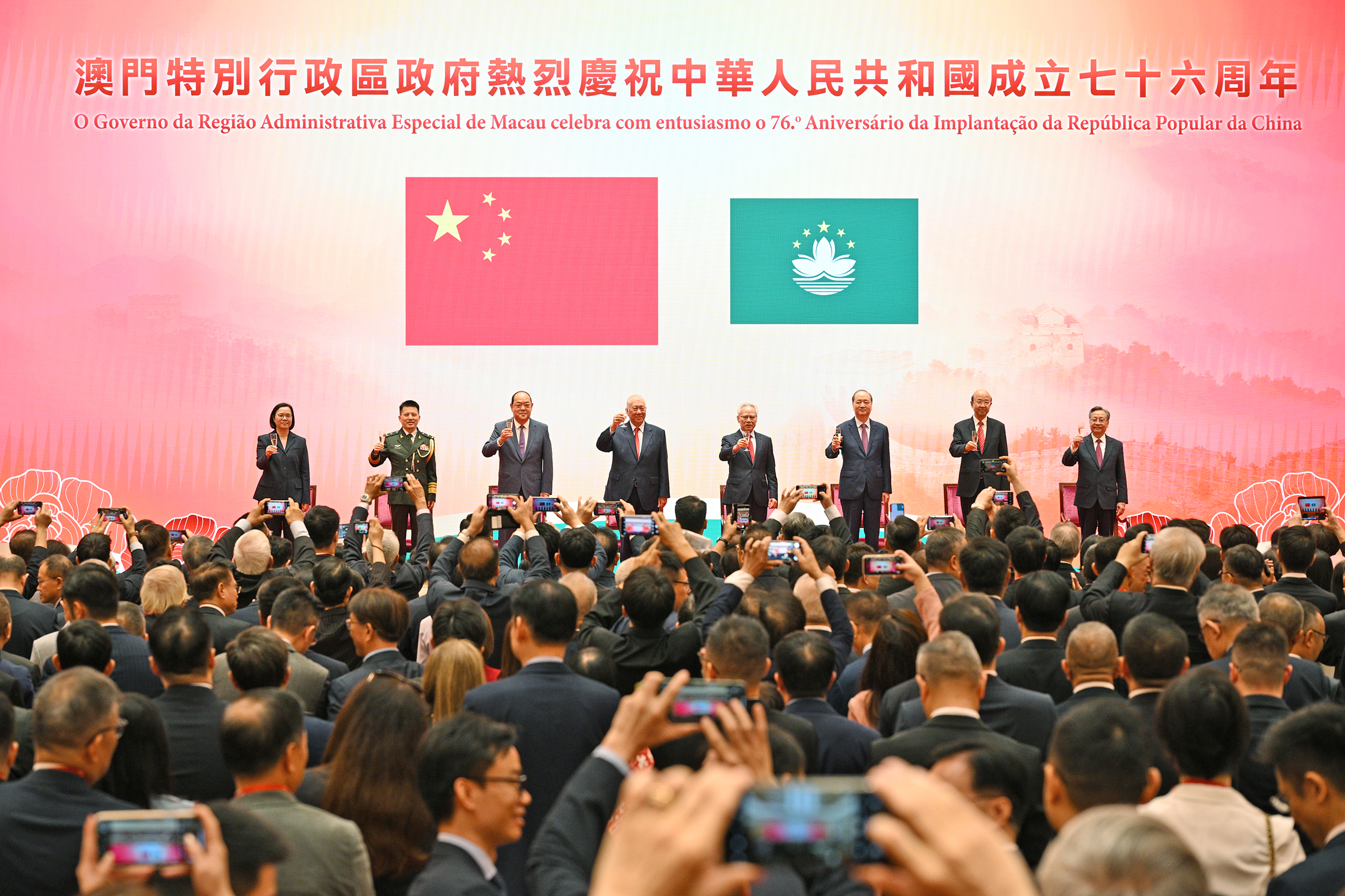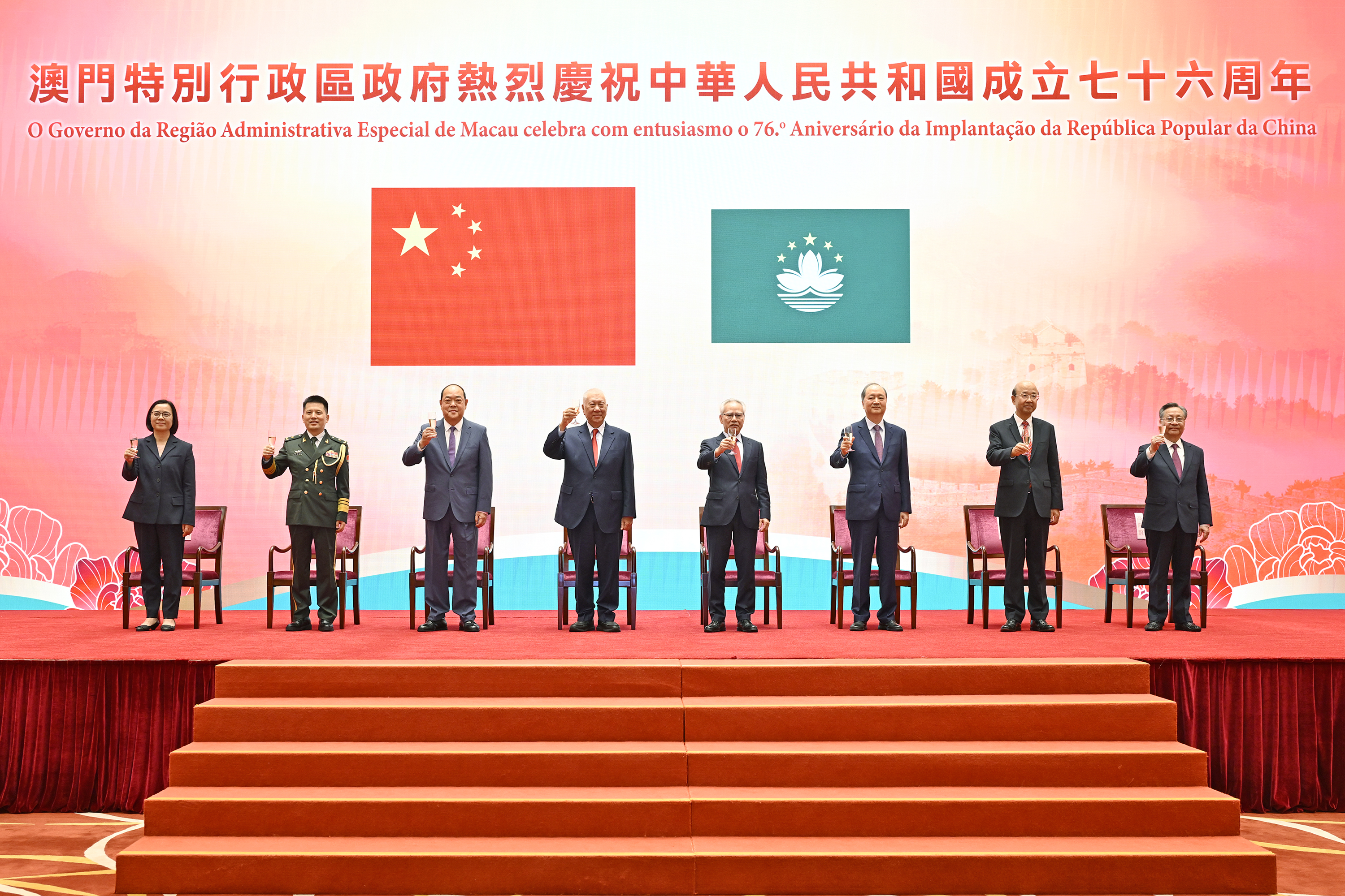 (大公文匯全媒體 記者 王祥康)澳門特區政府今日(1日)舉行酒會,慶祝中華人民共和國七十六周年酒會,澳門行政長官岑浩輝、全國政協副主席何厚鏵、中央人民政府駐澳門特區聯絡辦公室主任鄭新聰、前任行政長官賀一誠、外交部駐澳門特派員公署特派員劉顯法、解放軍駐澳部隊政治委員林慶華、立法會主席高開賢、終審法院院長宋敏莉、行政會委員、立法會議員、特區政府官員、澳區人大代表、政協委員及各界人士等約1,320人出席。