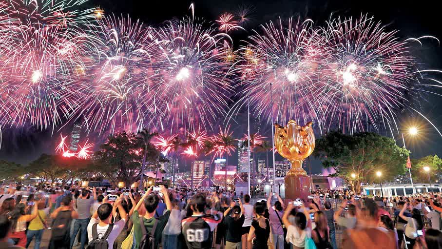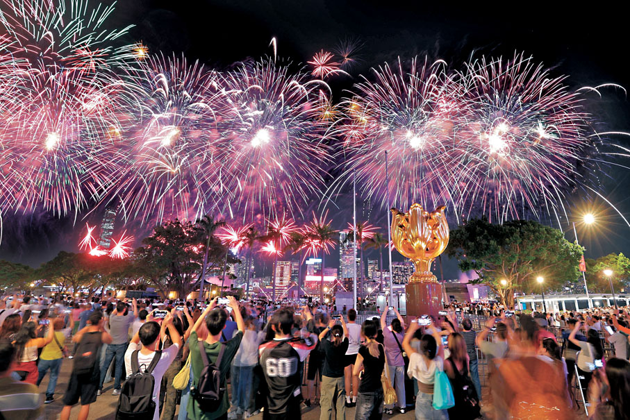 煙花匯演昨晚8時在維港舉行,警方估計,全程吸引超過34.4萬人在維港兩岸觀看,比預期多5萬人。今年主題為「維港煙花,閃耀中華」,分八幕共歷時23分鐘,發放逾3萬枚煙花。除祝賀國慶外,匯演亦分別以東江水、哪吒、大熊貓、航天夢、全運會等作主題,寓意深長。