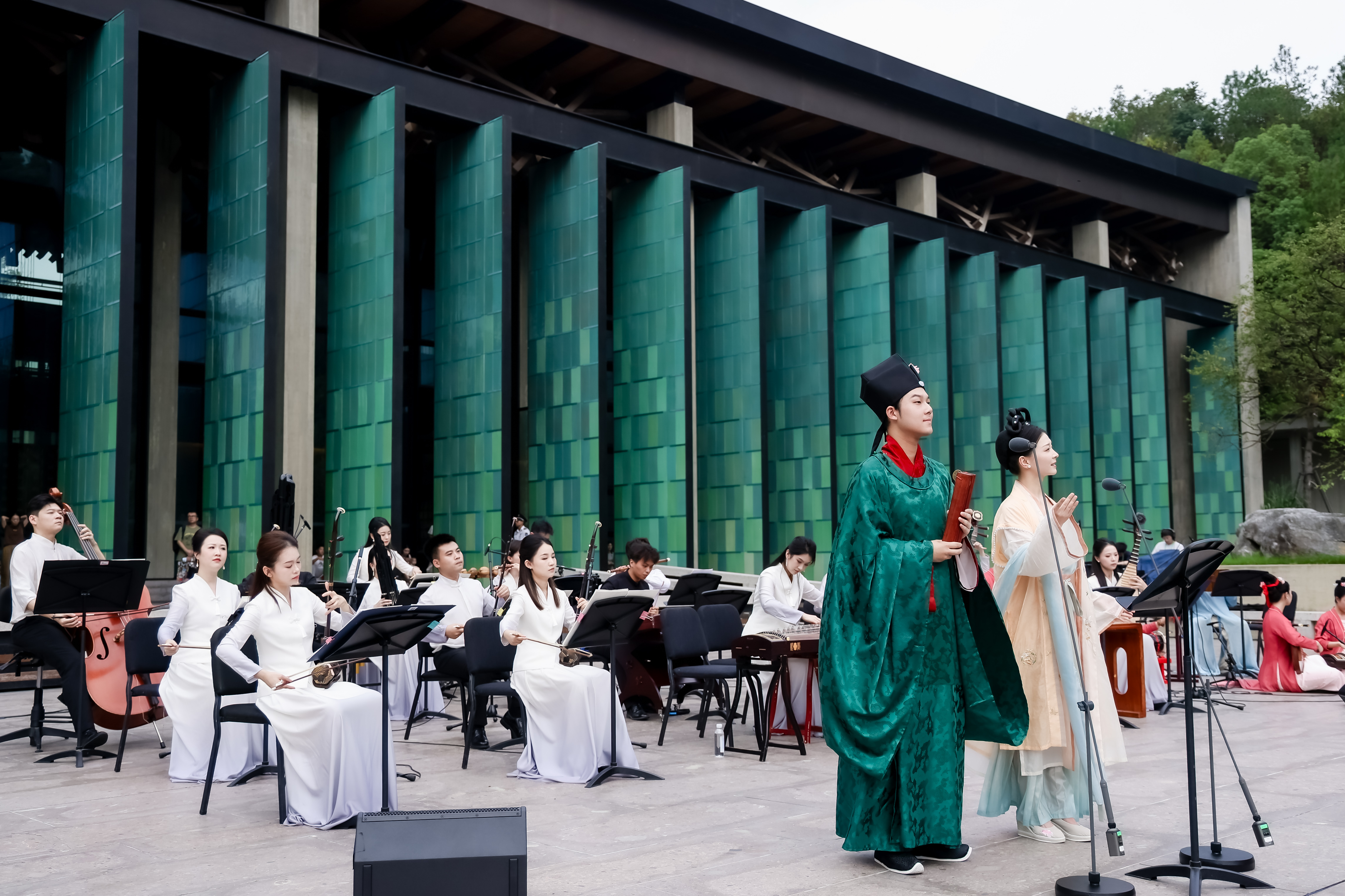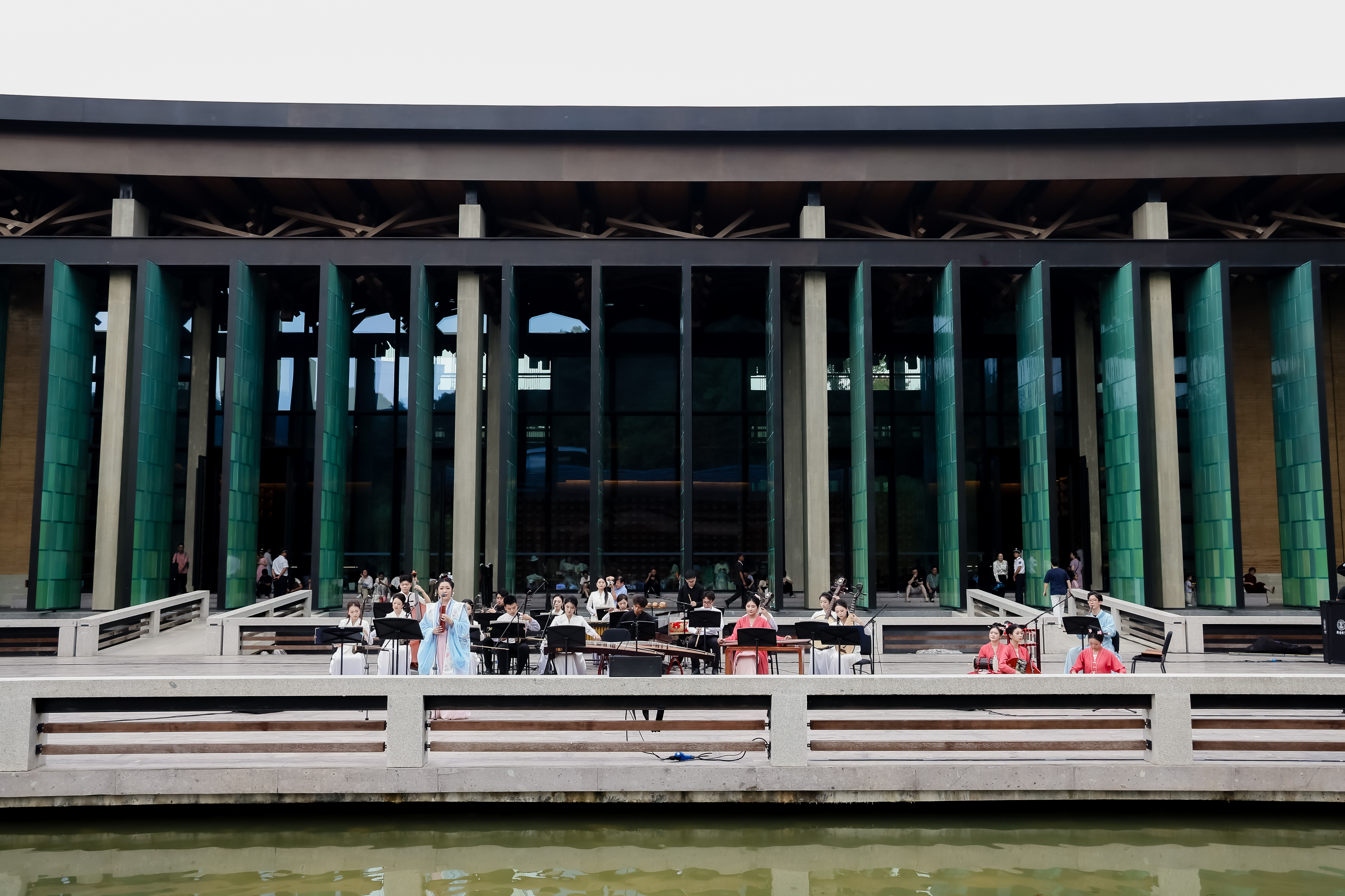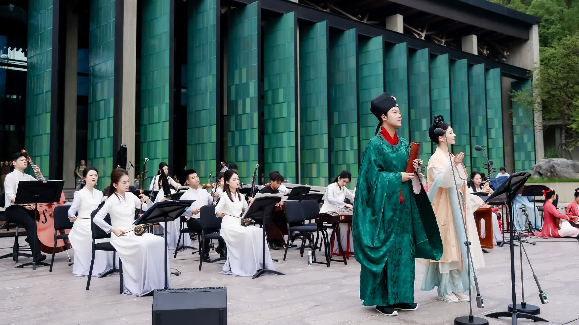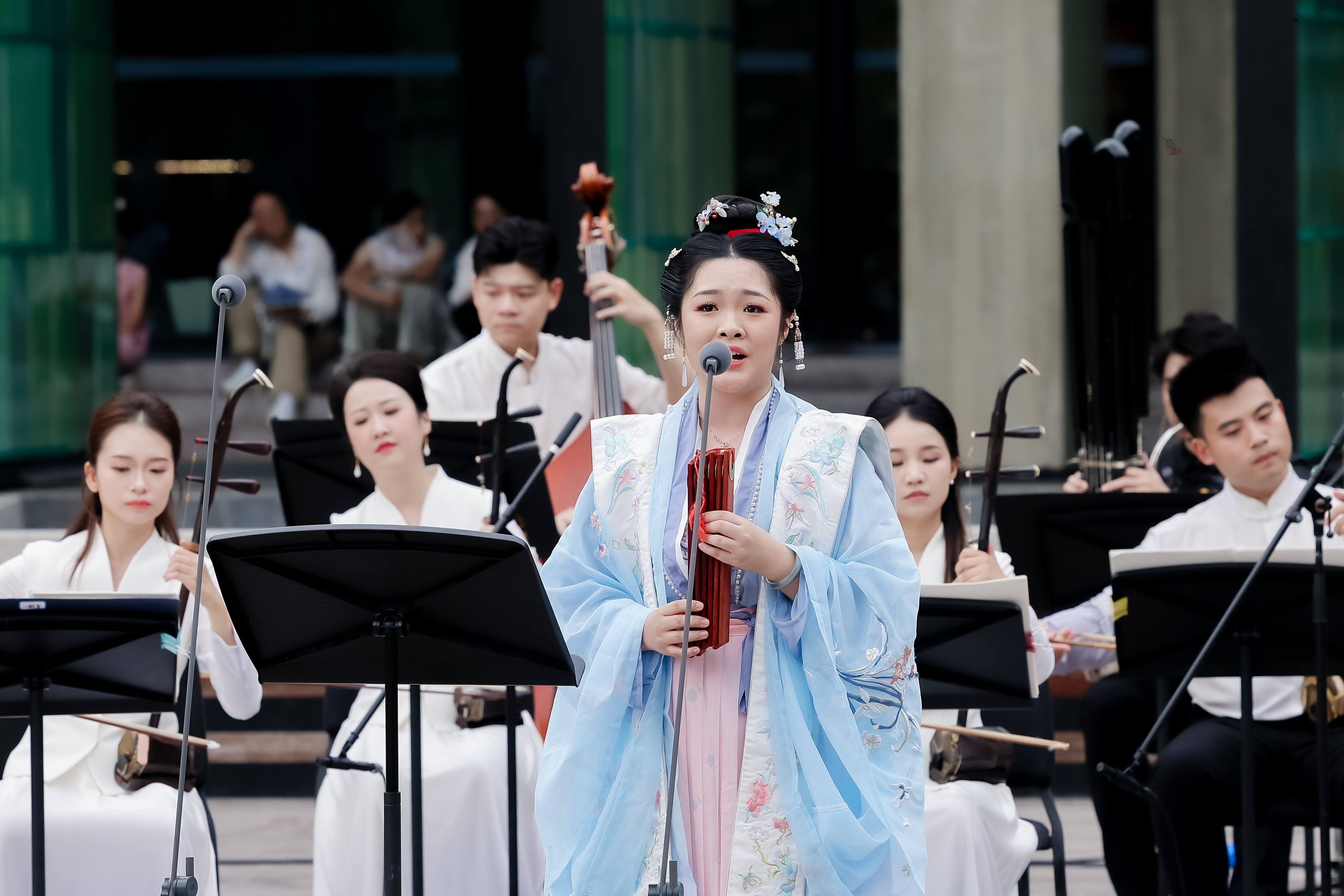 裊裊秋風,清歌是舉。10月1日下午,一場宋詞古曲音樂會——《宋韻流聲·秋之章》在杭州國家版本館南園舉行。柳永的《雨霖鈴》、辛棄疾的《踏莎行》、李清照的《一剪梅》、姜夔的《暗香》《疏影》、周邦彥的《六醜》等宋詞名家名作經過譯解古譜、擬古配樂,當代青年作曲家的創編後,由青年歌唱演員現場演唱。穿越千年的時光,音樂會將宋詞古曲復活在耳邊,讓宋詞不再是書本上的文字,而是可以聆聽的旋律,吸引了近千名觀眾圍觀,為杭州館增添了濃厚的節日氛圍。