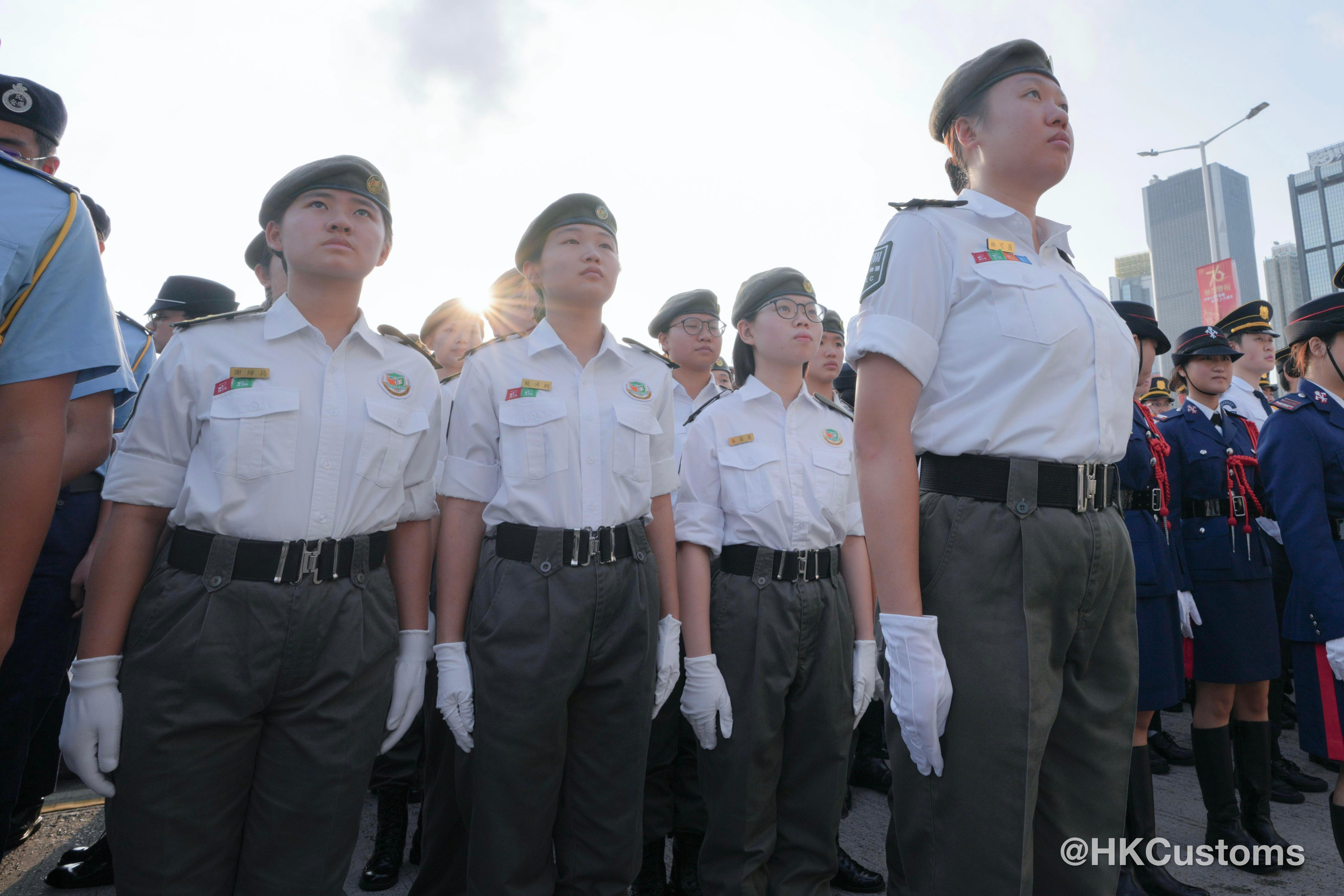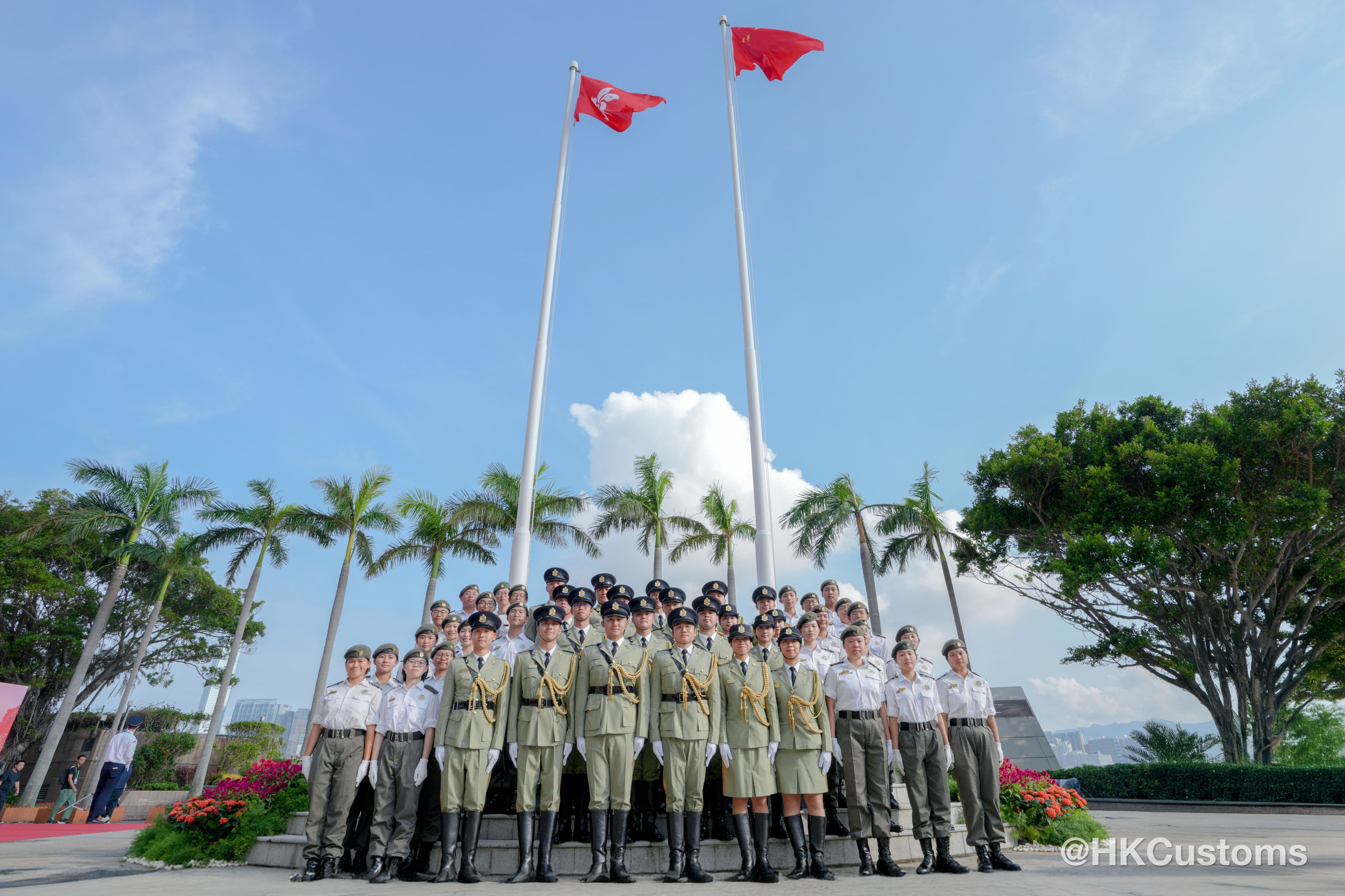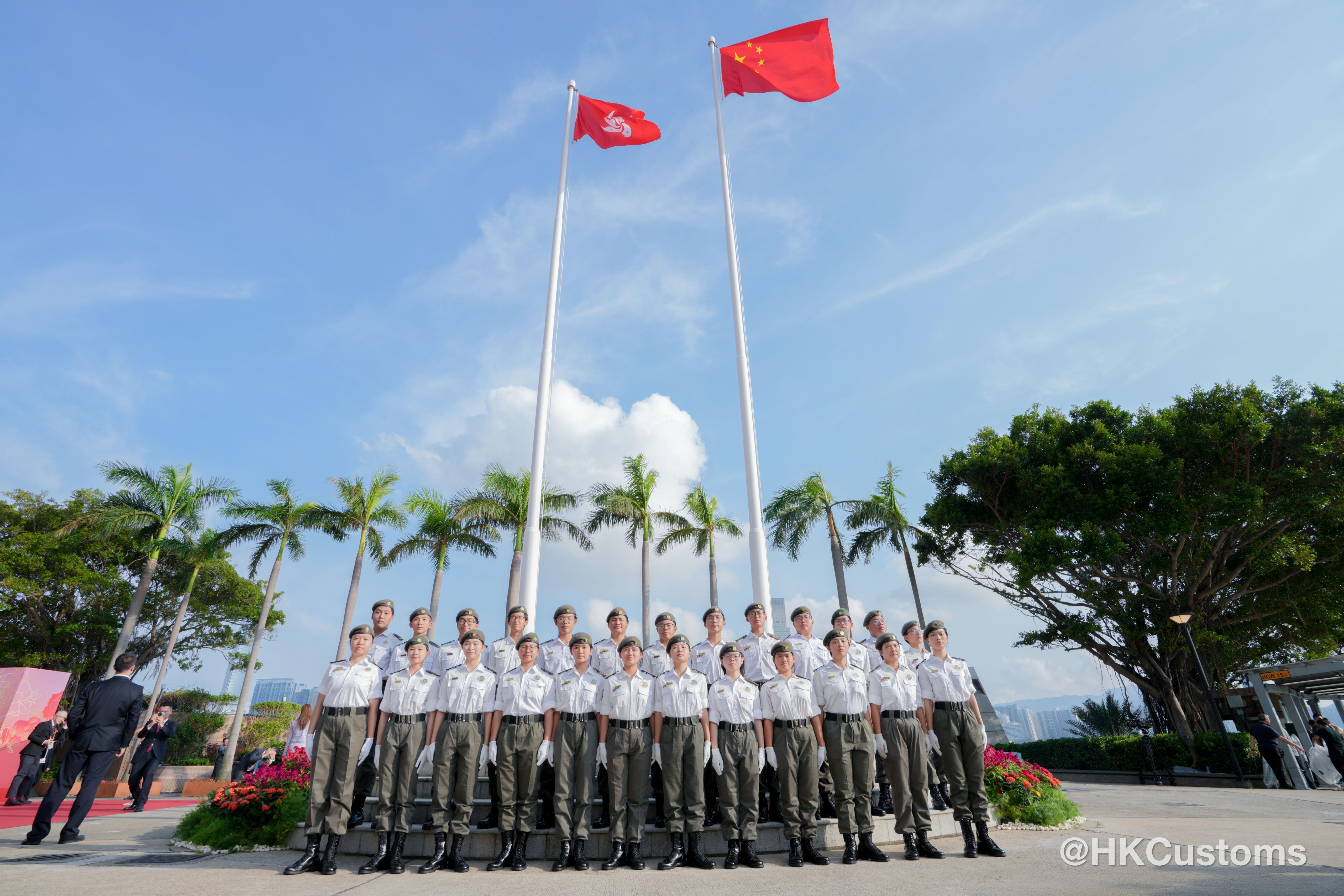 香港海關儀仗隊聯同其他紀律部隊儀仗隊昂首闊步,以中式步操參與升旗儀式,彰顯香港社會的繁榮和安定。同時,香港海關青年領袖團亦參與其中,展現青年新一代的愛國情懷及抱負。參與升旗儀式的儀仗隊隊員及領袖團團員親身感受這光榮時刻,為身為祖國的一份子感到無比自豪。