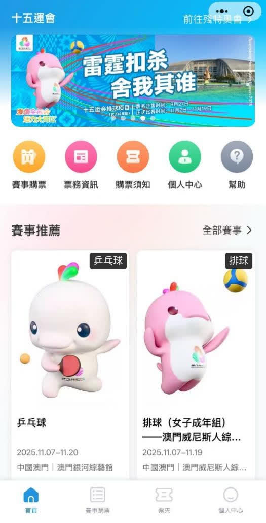 自上周六起澳門賽區開放三個項目售票,涵蓋排球(女子成年組)、空手道及乒乓球三大項目,反應熱烈。其中,乒乓球部分熱門場次的門票在線上開售僅三分鐘內迅速售罄,充分展現賽事的強大號召力與球迷的高度期待。