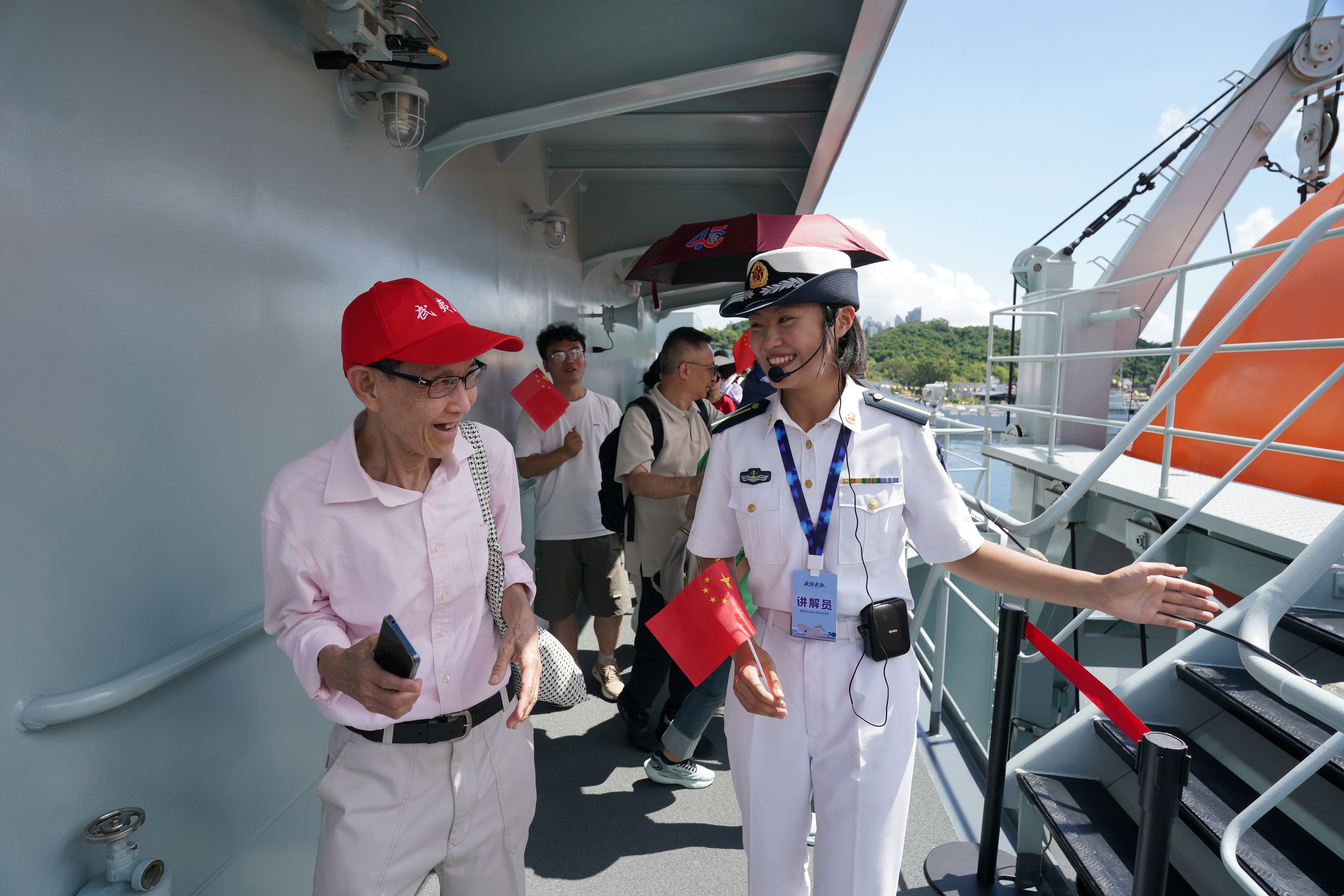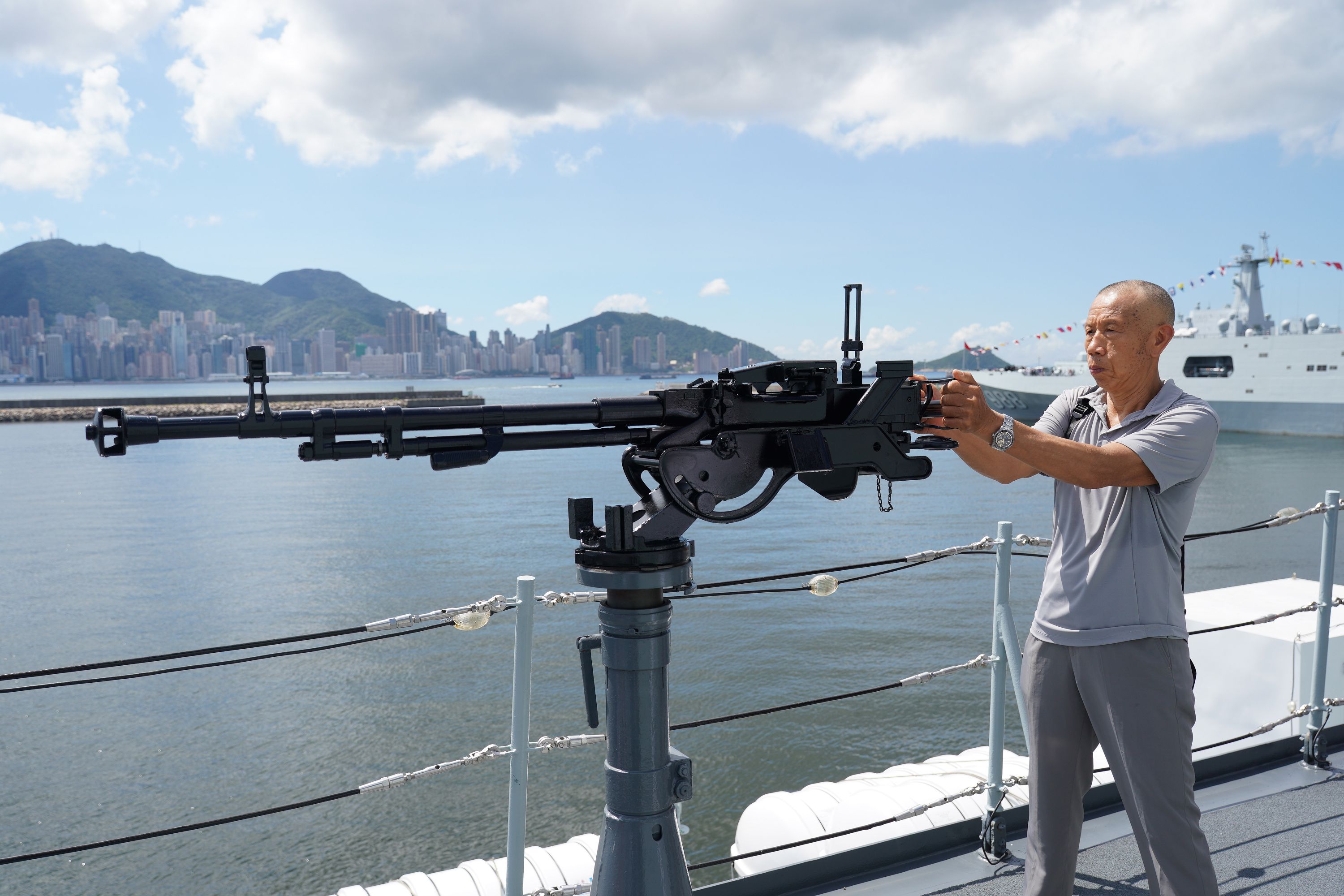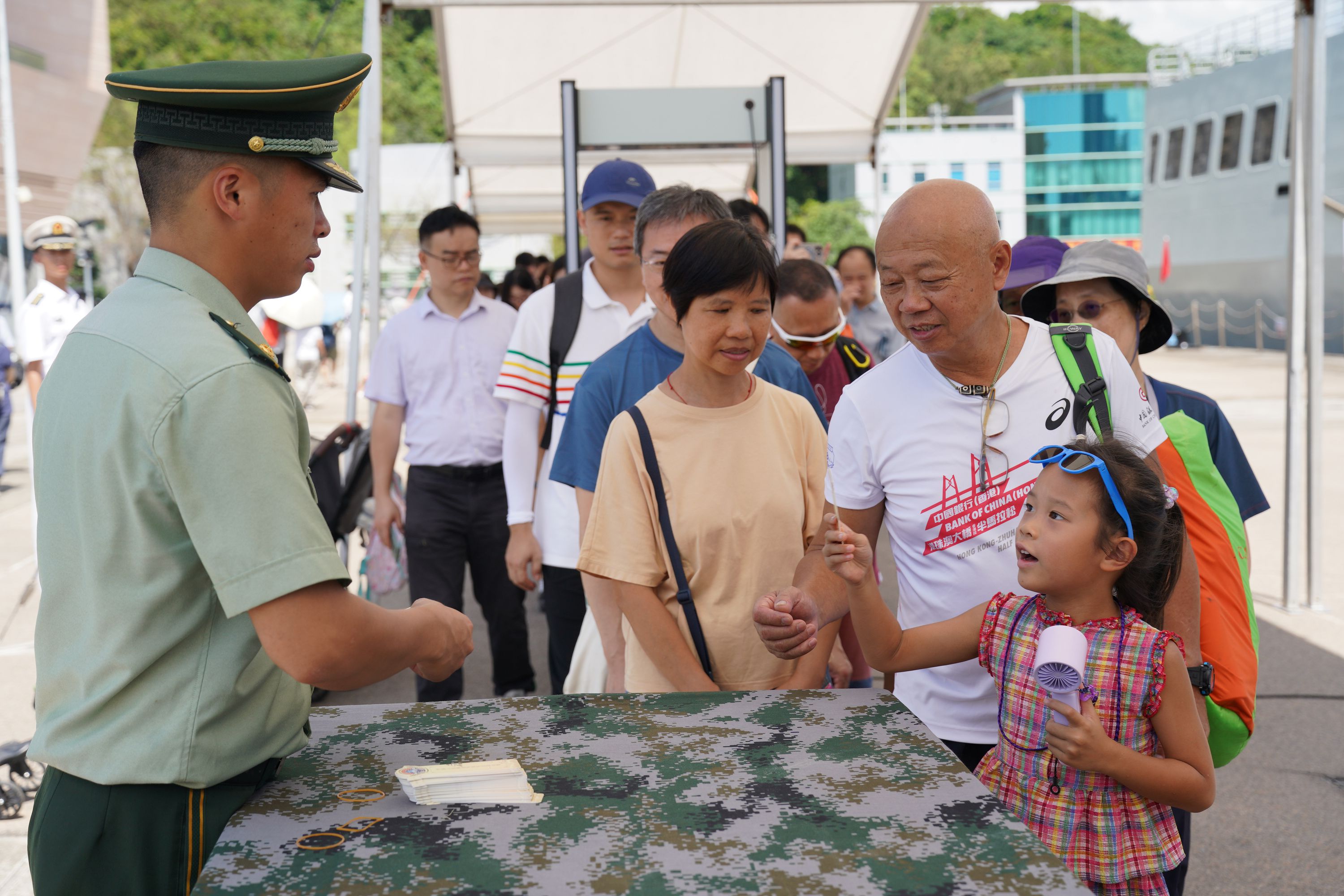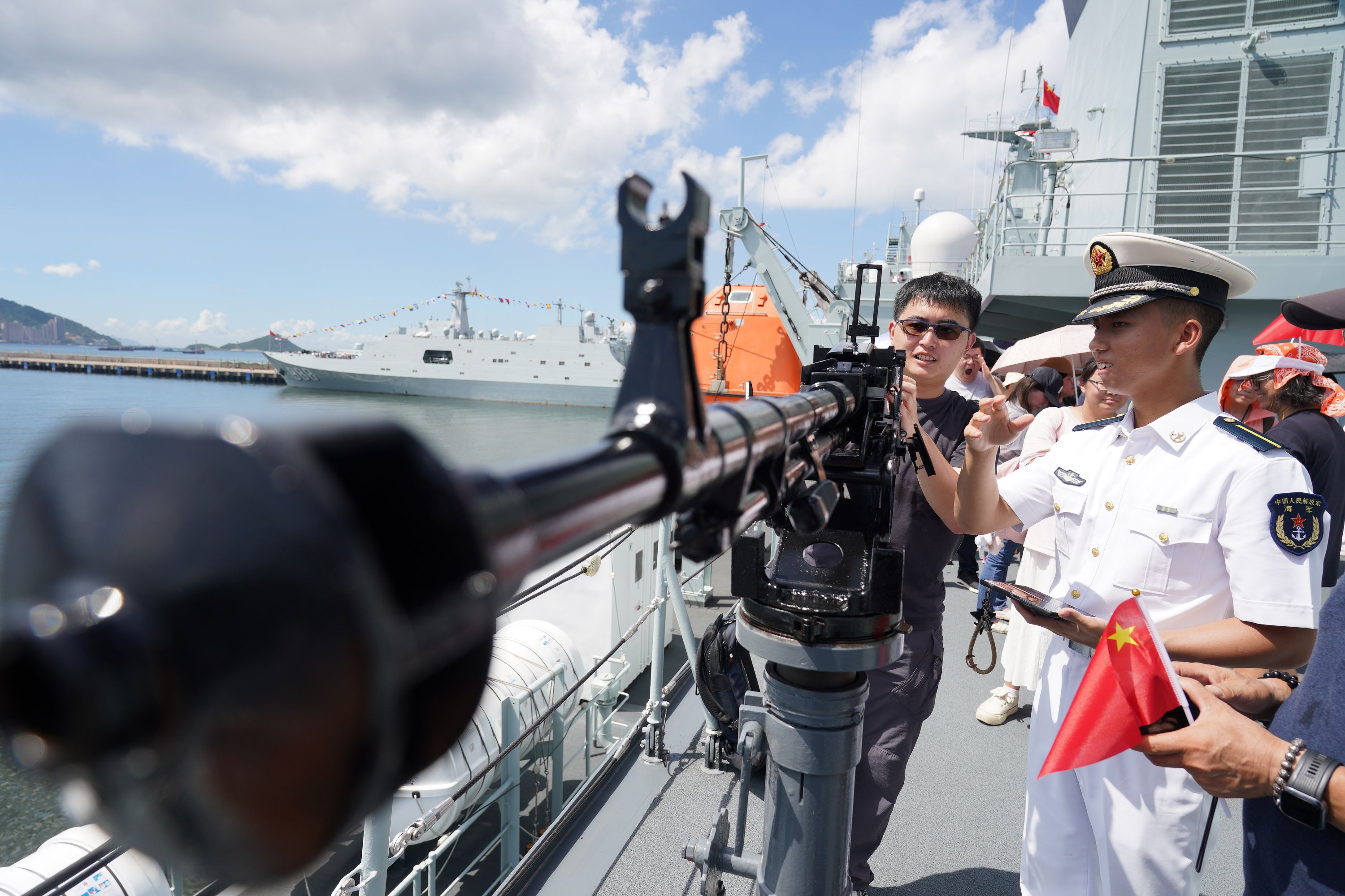 大公文匯全媒體報道,由海軍戚繼光艦、沂蒙山艦組成的83艦編隊今日(10月2日)繼續在昂船洲軍營舉辦艦艇開放活動。雖然天氣炎熱,市民的熱情卻絲毫未減,紛紛登艦參觀,一睹「國之重器」的雄偉風采,感受海軍力量的磅礴氣勢。現場氣氛熱烈,市民們與艦上官兵互動,合影留念,爭相打卡記錄這難忘時刻。許多人還親身體驗了槍械操作,近距離感受軍事裝備的精妙與力量。