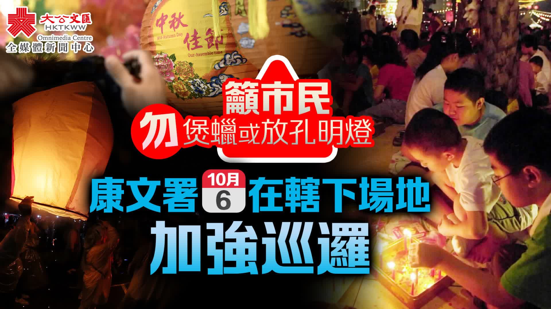 大公文匯全媒體報道,康樂及文化事務署今日(10月2日)呼籲市民,在歡度中秋佳節之餘,切勿煲蠟或放孔明燈,並必須保持地方整潔。為確保市民能在安全和衞生的環境慶祝佳節,康文署將會調配人手於10月6日(農曆8月15日)在轄下場地,包括公園、公眾泳灘及燒烤場等加強巡邏,對亂拋垃圾、煲蠟、拋擲物件到樹上或放孔明燈的人士採取執法行動。