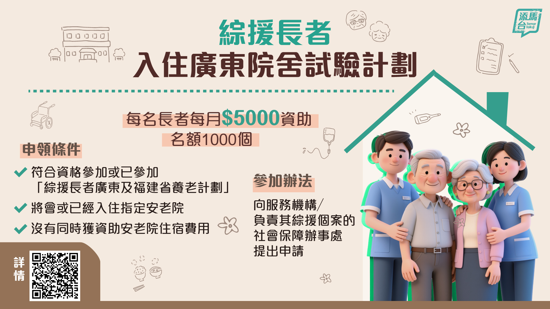 「綜合社會保障援助長者入住廣東院舍試驗計劃」現已推出,為期3年,為選擇赴粵養老的綜援受助長者提供資助,入住「廣東院舍照顧服務計劃」下的安老院,每人每月可獲港幣5,000元資助,名額共1,000個。