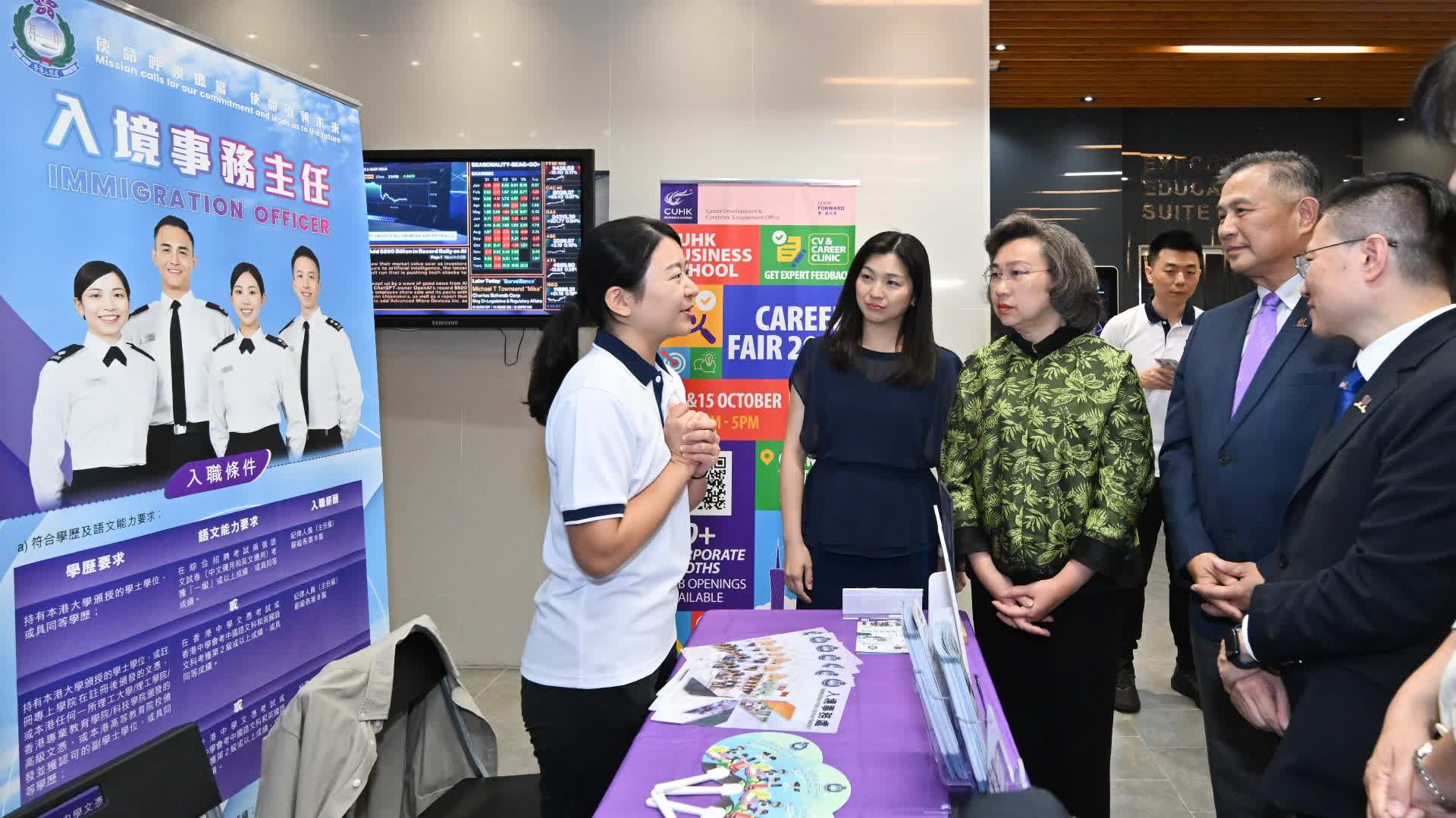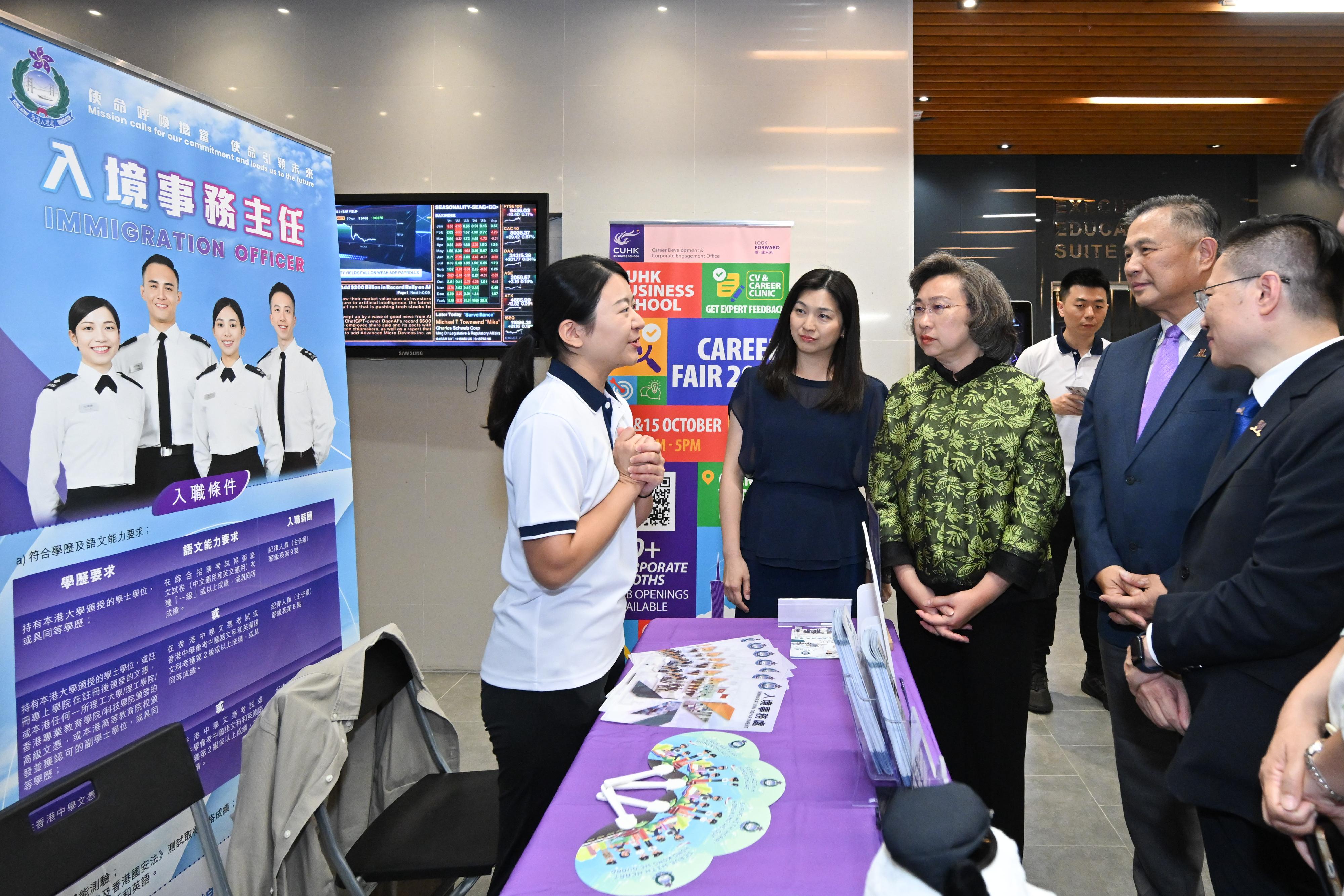 大公文匯全媒體報道,公務員事務局局長楊何蓓茵今日(10月2日)下午與中大副校長(教育)金國慶,一同參觀在中大校園舉行的政府職位招聘展覽,鼓勵大學生按自己的志趣多了解政府不同部門的工作,以及政府為年輕人提供的就業機會,及早做好生涯規劃。公務員事務局是第3年與中大合辦招聘展覽,為大學生提供一站式實用的招聘資訊,而同學亦可以即場向來自不同職系的現職公務員提問。