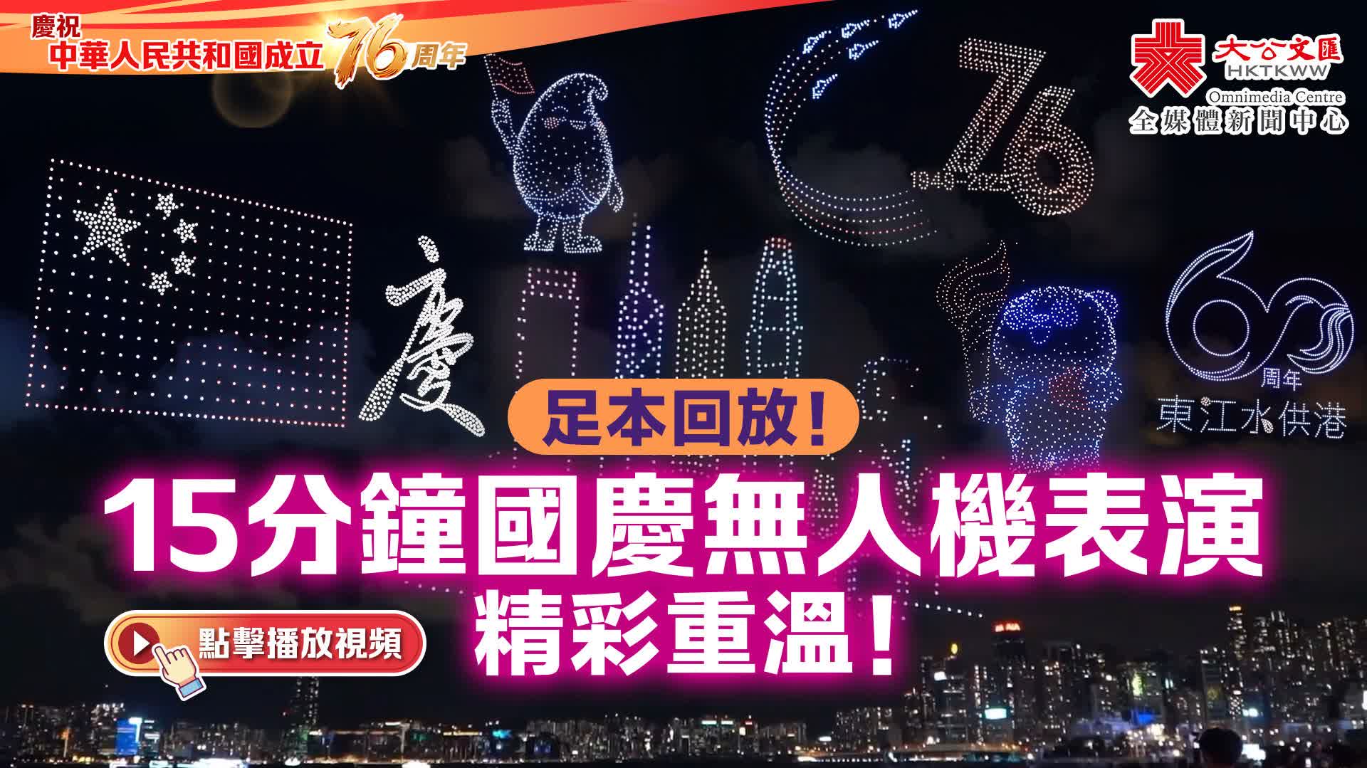 大公文匯全媒體報道,「香港同胞慶祝中華人民共和國成立七十六周年國慶文藝晚會」今晚(2日)在紅磡香港體育館盛大舉行,活動首次引入無人機匯演,於灣仔海濱放飛1200架無人機,進行為期15分鐘的表演。無人機展示大型「慶」字、東江供水60周年紀念圖案、航母山東艦,以及香港特色圖案,如紫荊花、帆船和地標等。大公文匯全媒體一片帶你回顧無人機表演的精彩時刻!