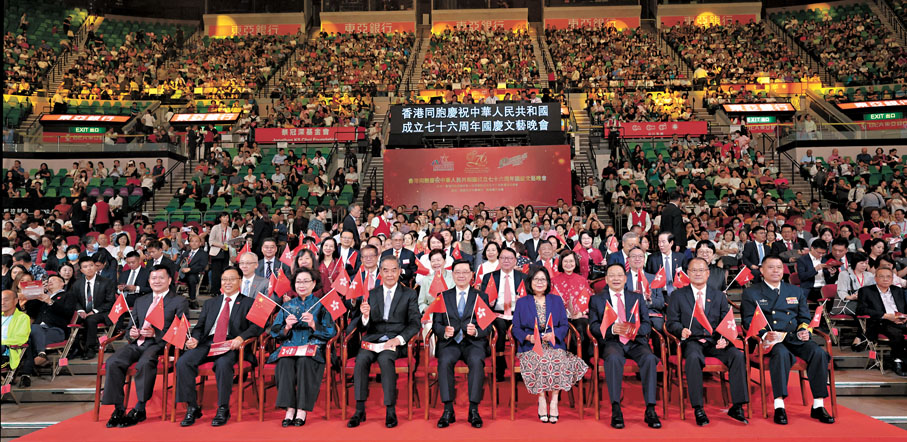 今年國慶文藝晚會由香港同胞慶祝中華人民共和國成立76周年籌備委員會主辦,民政及青年事務局及民政事務總署協辦。晚會主禮嘉賓包括全國政協副主席梁振英、香港特區行政長官李家超、中央政府駐港聯絡辦副主任尹宗華、外交部駐港特派員崔建春、中央駐港維護國安公署副署長陳楓、解放軍駐港部隊參謀長魏德明、前行政長官林鄭月娥、政務司司長陳國基、財政司司長陳茂波、律政司司長林定國、香港同胞國慶籌委會執行主席蔡冠深等。