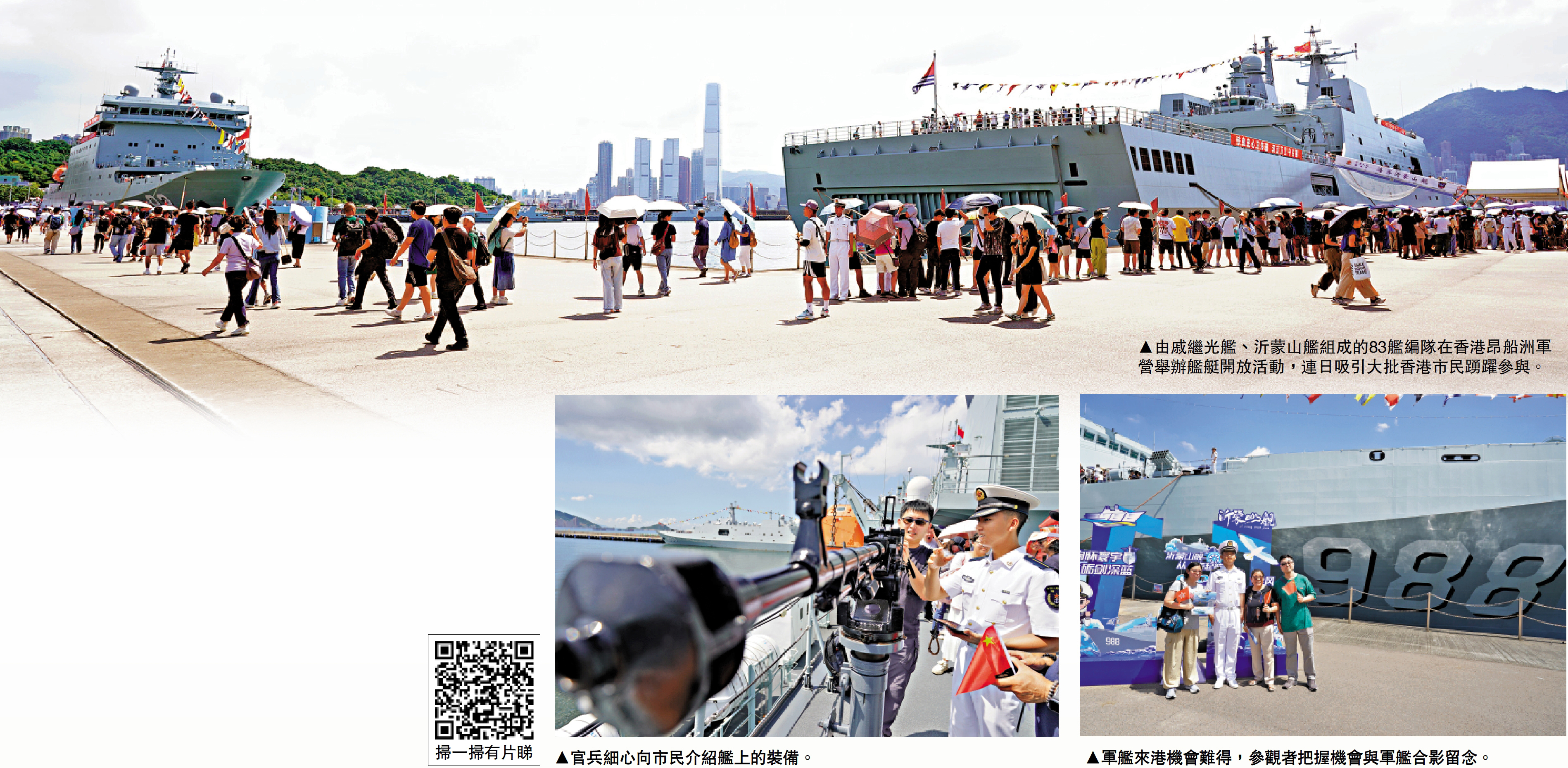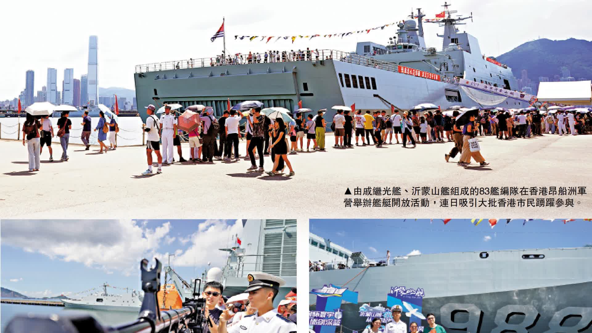 由海軍戚繼光艦、沂蒙山艦組成的83艦編隊昨日繼續在昂船洲軍營舉辦艦艇開放活動,現場人潮湧動,氣氛熱烈。來自杭州的金小姐帶着8歲的兒子大力,一早便來到碼頭,迫不及待要一睹國家軍艦的風采。
