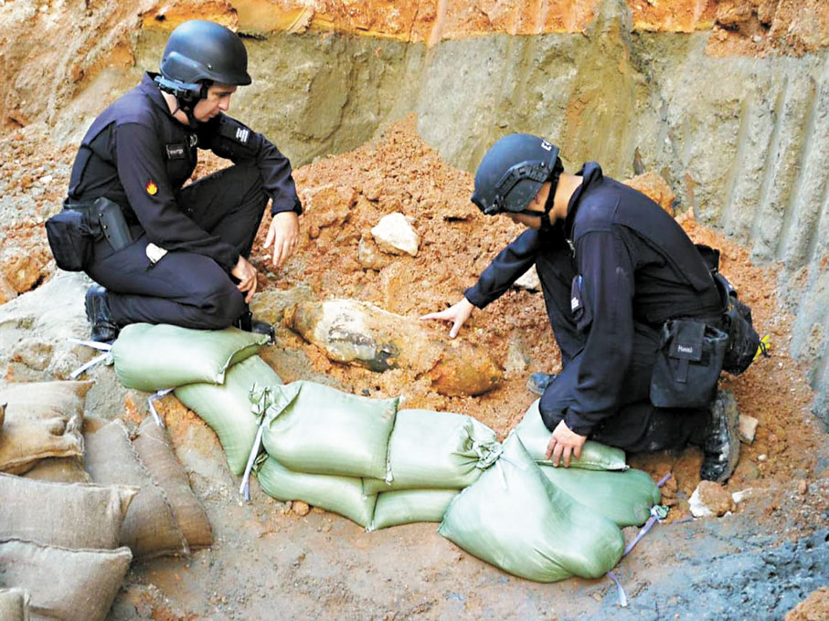 香港部分地區的地底埋有炸彈,爆炸品處理課高級炸彈處理主任、高級警司李展超解釋,日軍進攻香港的主要戰場為九龍半島及港島北部,其推進路線包括灣仔、馬己仙峽道,一直推進到赤柱,故山林內常會發現英國及日軍的小型迫擊炮、手榴彈等軍火,灣仔北沿海地帶包括當年太古船塢則是榴彈區。此外,日佔期間,美軍多次來港投擲炸彈以摧毀日軍據點,故啟德重建地盤、灣仔北沙中線地盤及鰂魚涌舊太古船塢是戰時炸彈高發現區,正反映當年高密度投彈情況。