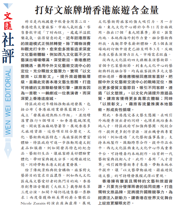 昨日是內地國慶中秋黃金周第二日,香港迎來大量旅客,市面人氣旺盛,零售餐飲市道「丁財兩旺」,處處洋溢歡樂氣氛。值得留意的是,近年訪港旅客的旅遊模式正悄然轉變,除了購物消費和觀光打卡外,愈來愈多旅客追求深度文化藝術體驗,例如西九文化區不少文藝演出場場爆滿,深受歡迎。香港應把握機遇,善用中外文化藝術交流中心的定位,充分釋放文藝潛力,實現「以文塑旅、以旅彰文」,提升旅遊體驗層級,並藉此完善本港文藝生態圈,打造可持續的文旅聯動發展引擎,讓旅客因為一首歌、一齣劇或一位表演者,而深深愛上香港這座城。