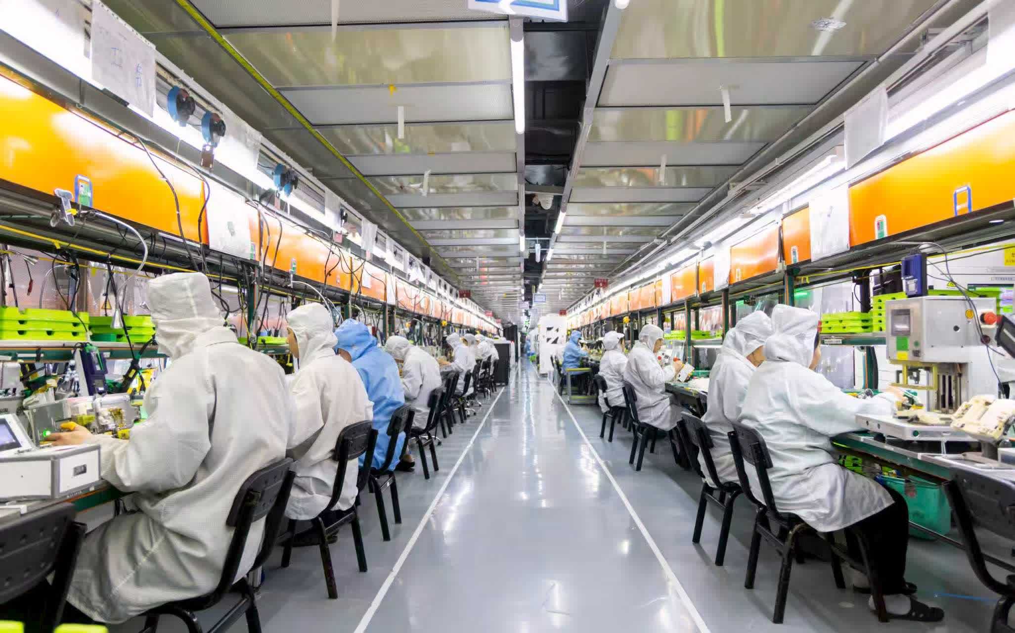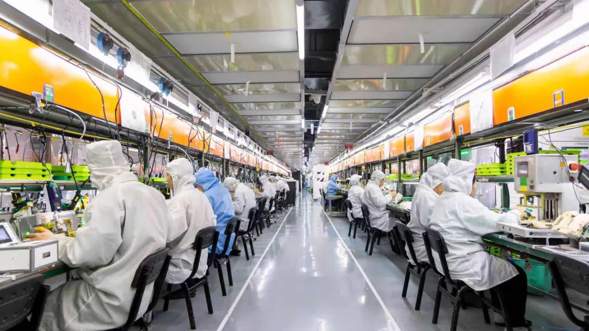 貼物料、裝蓋板、鎖螺絲、扣接口、塗底漆、檢查外觀……在製造二總處生產車間,工友們身着白色靜電衣坐在各自工位前緊張作業,流水線12道工序各司其職、分工合作、井井有條。