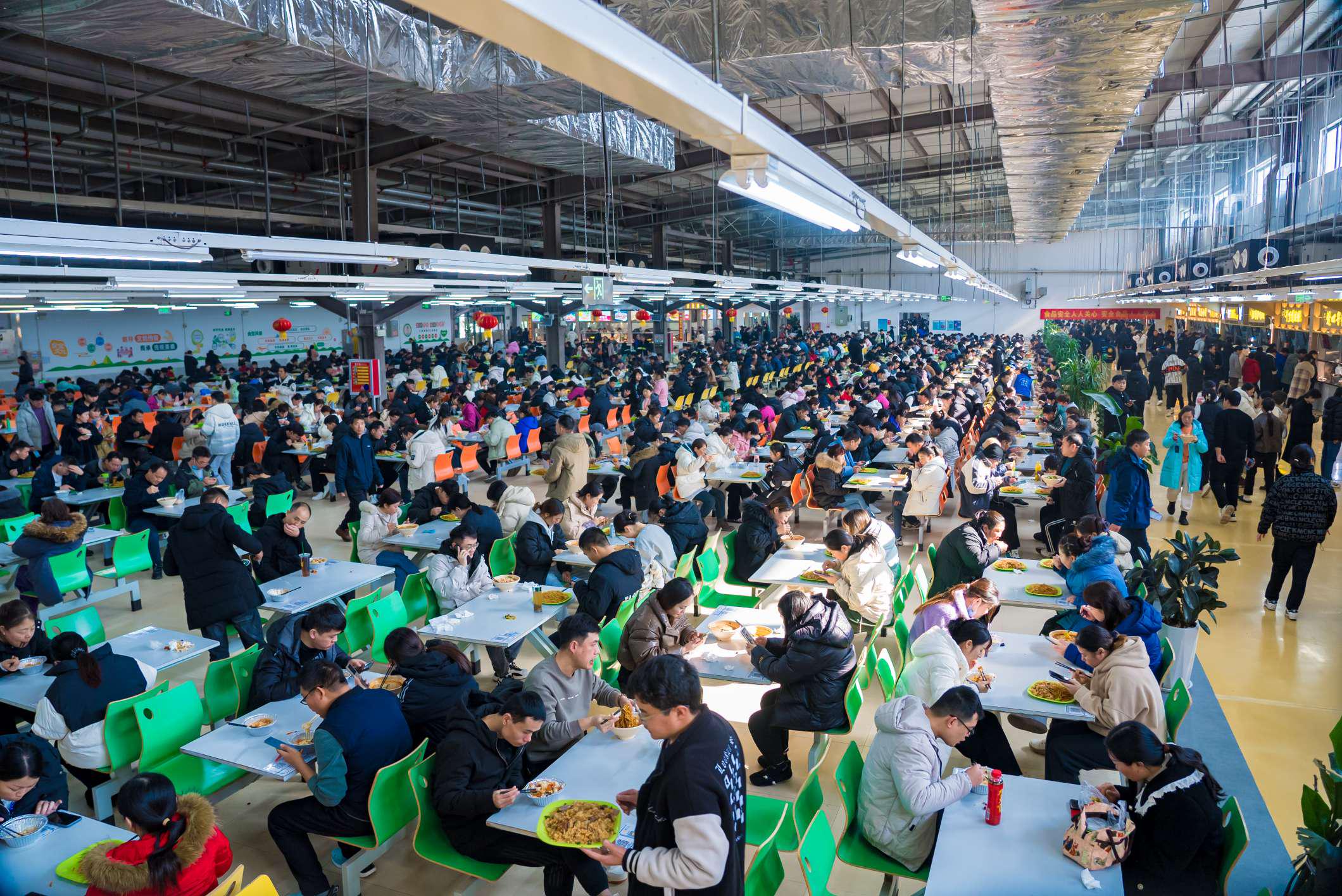 你見過6000人同時用餐的壯觀景象嗎?中午時分,來到鄭州富士康F15二層盛禾餐廳,員工正有序用餐,廣式腸粉鮮美嫩滑,港式燒臘油而不膩,單點自助豐儉由人……鄭州富士康園區設有9 棟餐廳樓200餘檔口,匯聚各地特色美食。「我們對食材進行農殘、獸殘及微生物等38項指標檢測,嚴格實行分區管理、全程溯源,加工關鍵節點全被納入智能預警系統,務必確保員工用餐『美味又安全』。」富士康鄭州綜保園區總務處處長閆化冰介紹。