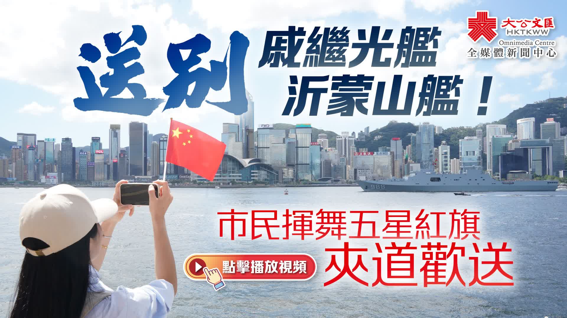 現場許多市民夾道歡送軍艦離港,更有市民手舉五星紅旗,並用手機記錄下軍艦的英姿。