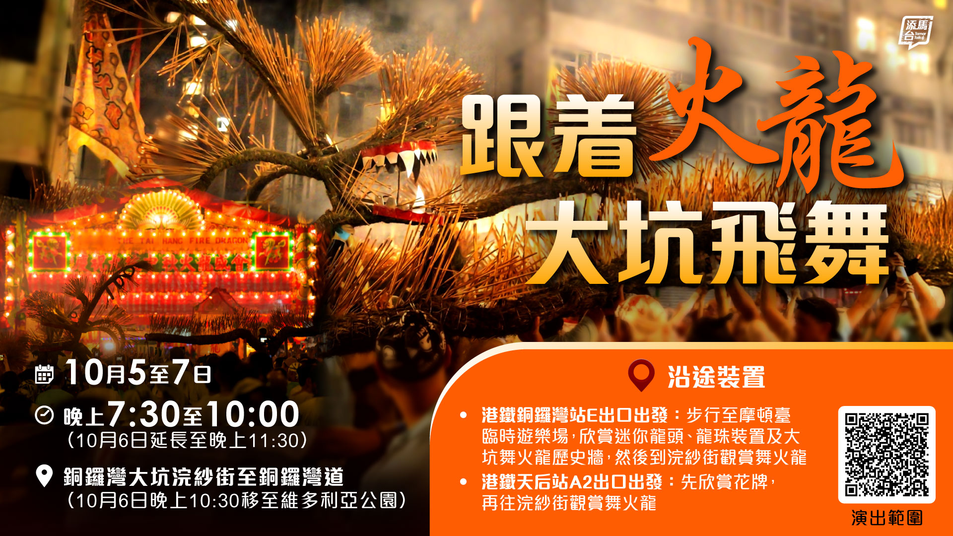 10月6日當天,大坑舞火龍會延伸至維多利亞公園,屆時公園現場可能比較擁擠。請提前計劃行程,並留意現場交通消息。