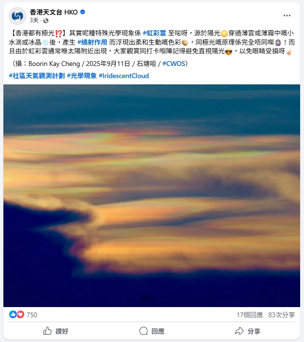 天文台在帖文中指「其實呢種特殊光學現象係虹彩雲至啱呀,源於陽光穿過薄雲或薄霧中嘅小水滴或冰晶後,產生繞射作用而浮現出柔和生動嘅色彩,同極光嘅原理係完全唔同㗎!」