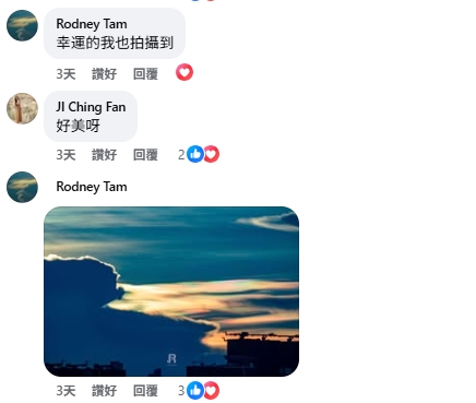 有回應的網民上載同一天空下的「虹彩雲」相片,留言指「幸運的我也拍攝到」;另有網民大讚這情況「好美」、「好夢幻」。