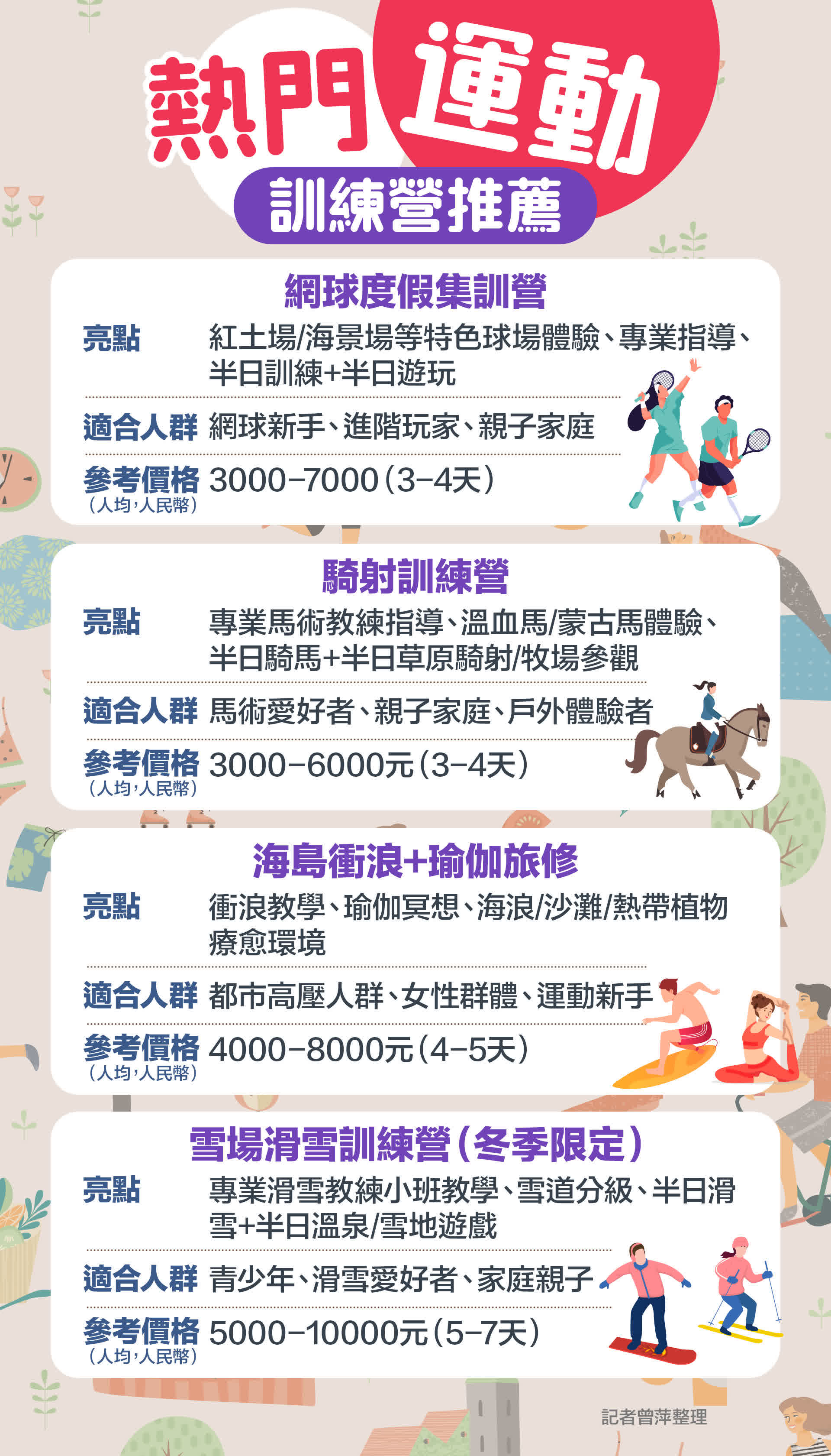(大公文匯網 記者 曾萍)當「度假」不再只是躺平看風景,當「運動」不再局限於健身房揮汗,今年國慶期間,「運動 + 度假」的新模式正悄然改變人們的假期選擇。據記者了解,以網球、衝浪、羽毛球等熱門運動為主題的訓練營在今年國慶假期人氣高漲,山東日照、海南陵水等地的網球訓練營名額緊張,成為不少運動愛好者的假期首選。「半日專業訓練 + 半日逛吃體驗」的搭配,既讓參與者收穫運動技能的成長,又能享受旅行的愜意,成為解鎖「成長型」假期的熱門方式。