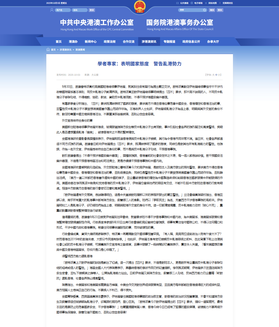 大公文匯網報道,中央港澳工作辦公室、國務院港澳事務辦公室,10月3日在網站轉載《大公報》題為《學者專家:表明國家態度 警告亂港勢力》的新聞綜述文章。文章強調,崔建春特派員對美國駐港總領事伊珠麗提出的「四不」要求既清晰表明了國家的態度,要求美方不得在香港從事危害中國安全、香港穩定和香港法治的事,並警告反中亂港分子不要妄想將美國當作靠山而胡作非為。以下為文章詳細內容: