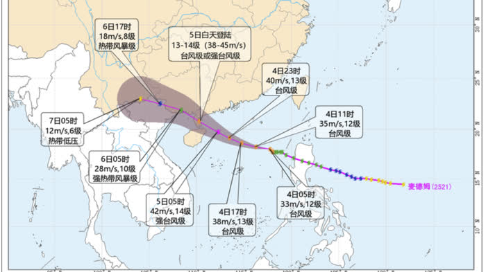 中央氣象台預計,「麥德姆」將以每小時25~30公里的速度向西偏北方向移動,強度逐漸增強,並向廣東西部到海南島東部一帶沿海靠近,將於5日白天在廣東電白至海南萬寧一帶沿海登陸(颱風級或強颱風級,13~14級,38~45米/秒),登陸後強度逐漸減弱。