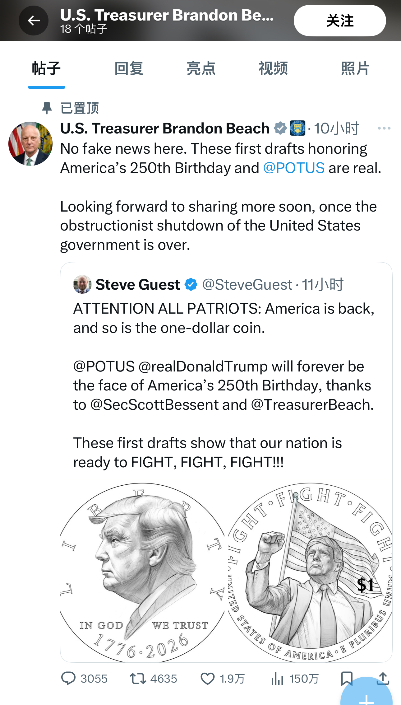 此外,美國財政部官員布蘭登·比奇在社交媒體上回應了這一消息,並稱「這不是假新聞。這些紀念美國建國250周年的首批初稿是真的。」他透露,一旦美國政府「關門」事件結束,他期待能盡快分享更多相關信息。他隨後在社交平台置頂了該條帖文。