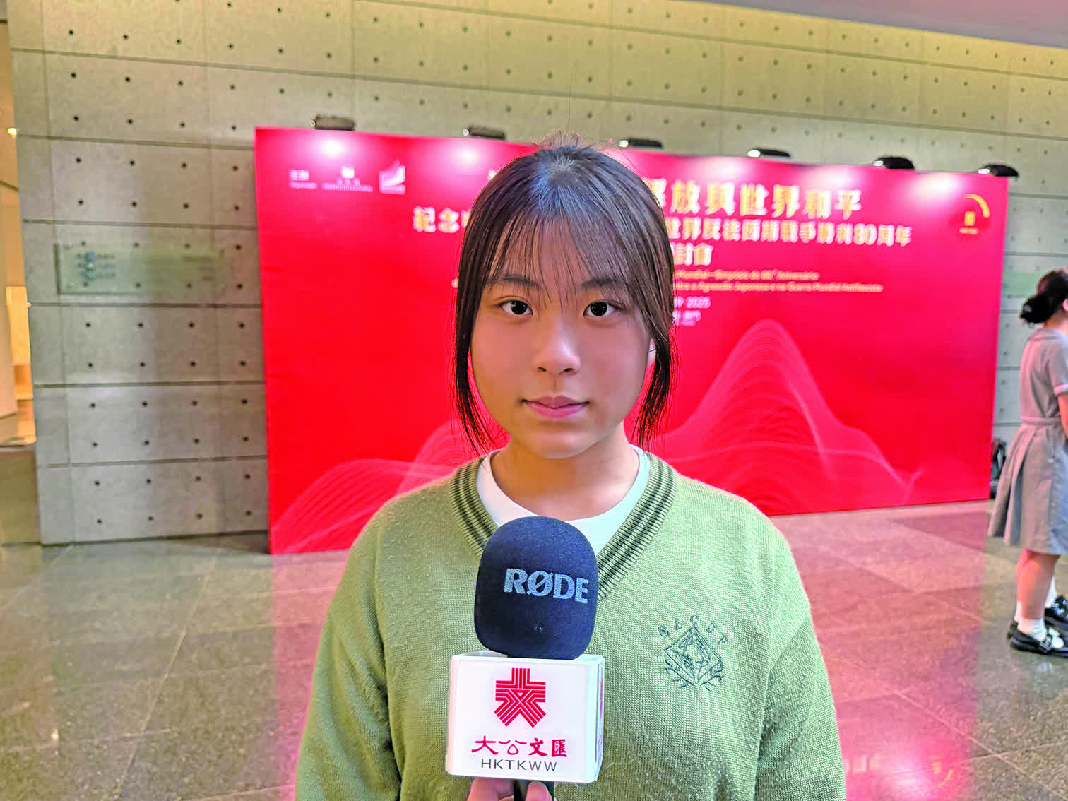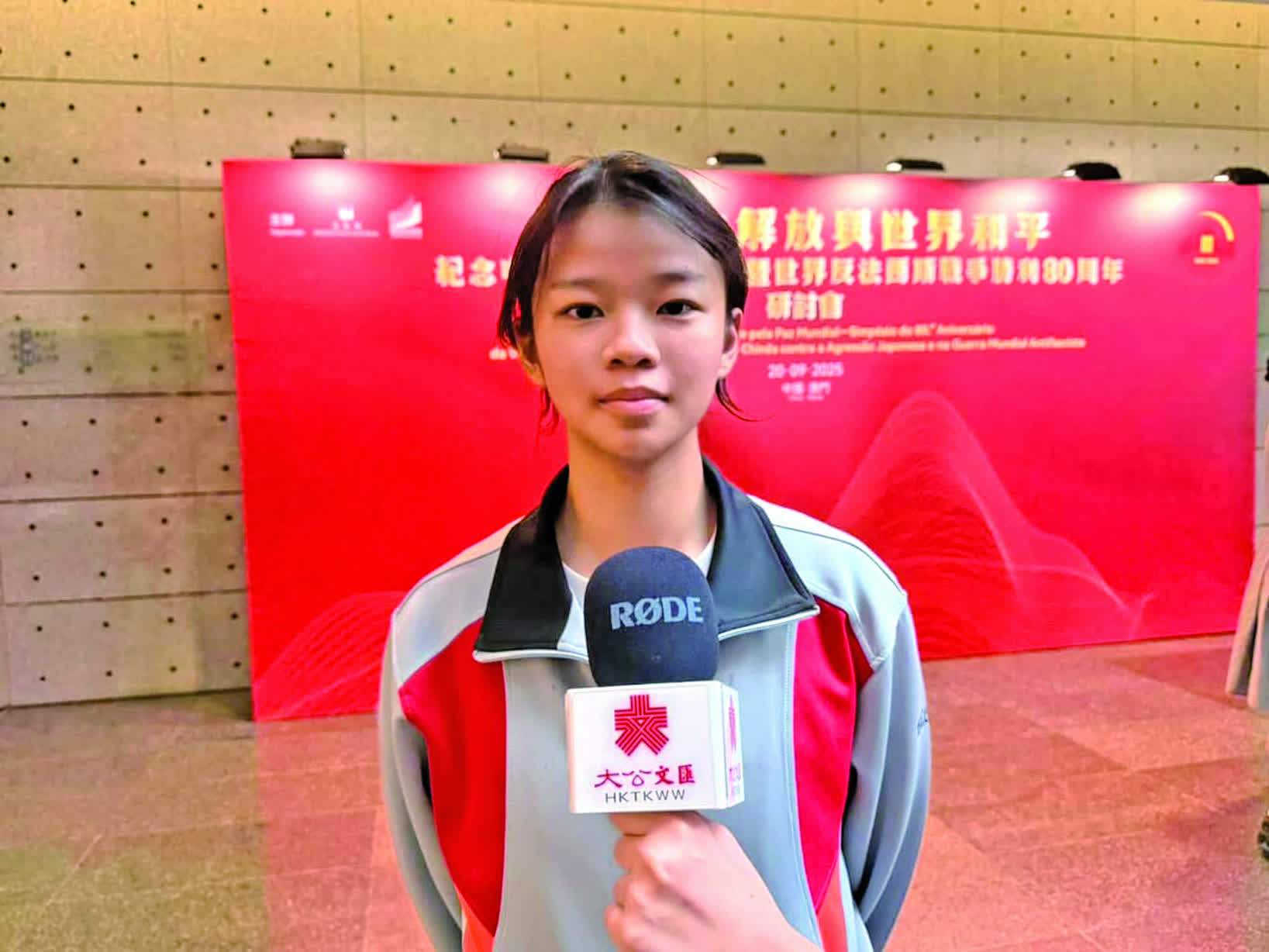 澳門高三學生洪戴晞表示,會後對抗戰精神有了更深入的理解,並領悟到抗戰勝利的背後彰顯了中華民族的團結,以及澳門與祖國始終血脈相連、風雨同舟的緊密聯繫。