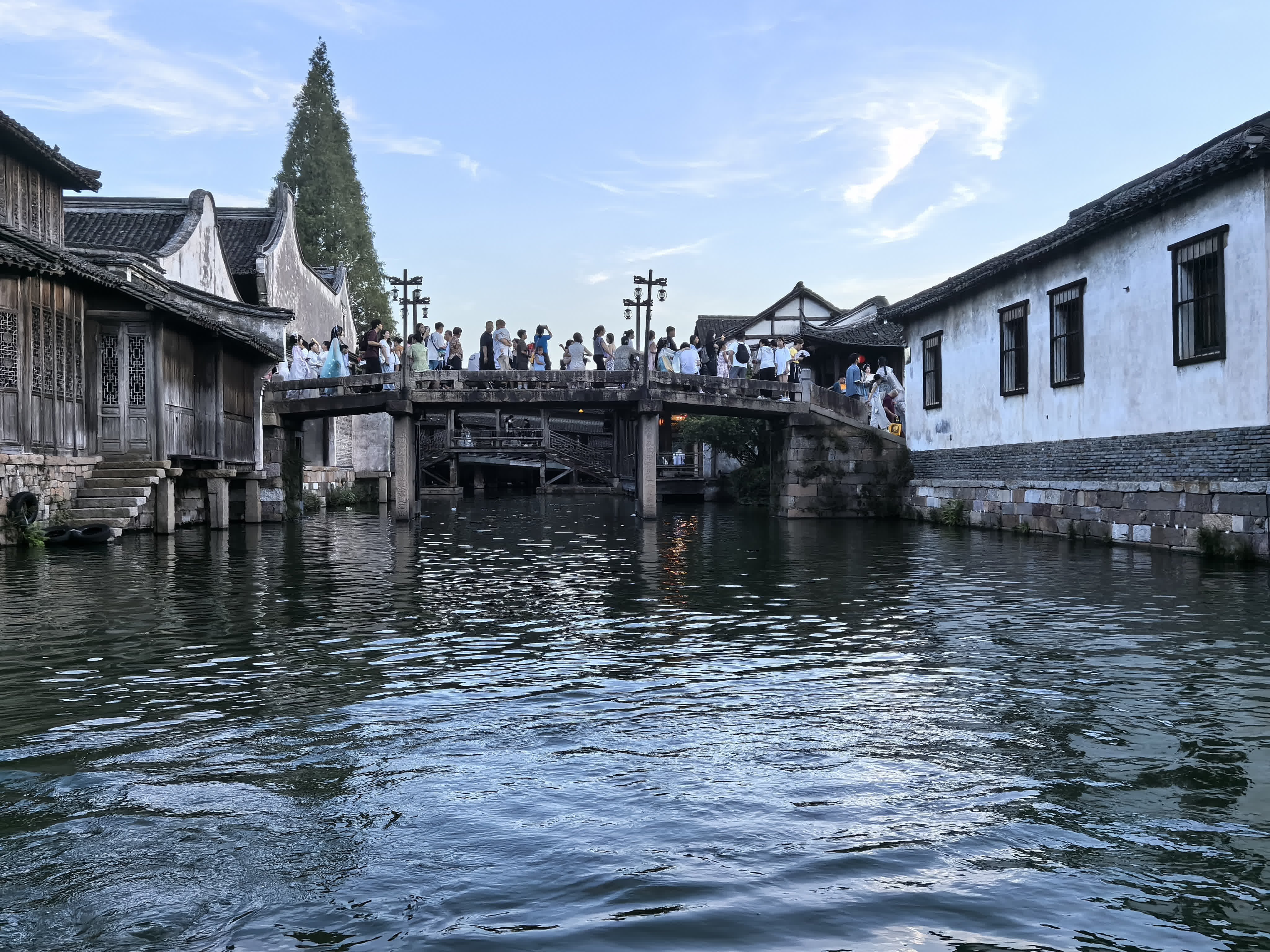 漫步至通濟橋畔,遠眺流水悠悠,搖櫓船緩緩穿行於橋洞之下,船夫的吆喝隨風飄來,彷彿在訴說着水鄉的往事。兩岸的老建築依水而建,木結構的窗欞、石階上的青苔,無一不在訴說着歲月的沉澱。烏鎮的美,不僅在於其外在的婉約,更在於那份貫穿始終的克制與秩序——沒有喧鬧的叫賣,一切都在靜謐中自然流淌。