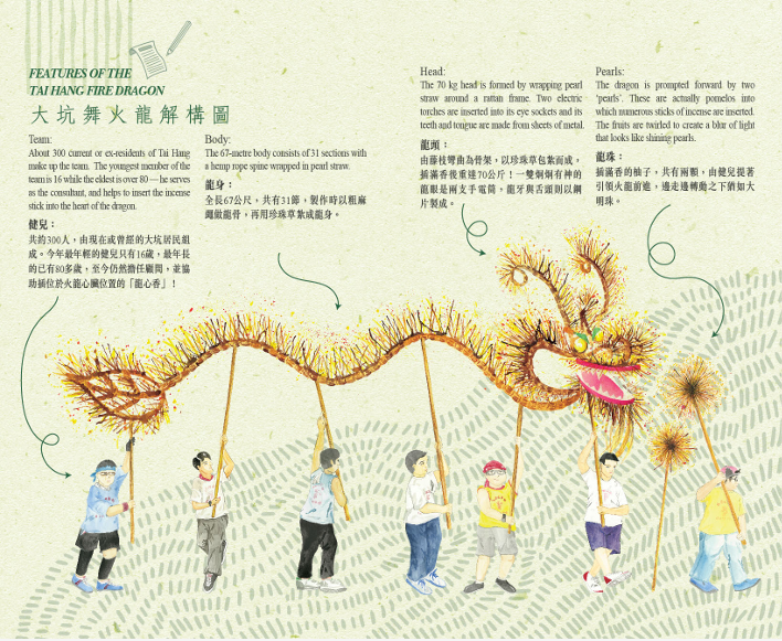 火龍長度達67公尺,相當於5.5架雙層巴士首尾相連!光是龍頭就重約48公斤,上面點綴着約12,000根燃燒的線香。如此有份量的火龍需要約300名健兒共同舞動,才能連續三晚在大坑街巷中靈活穿梭。