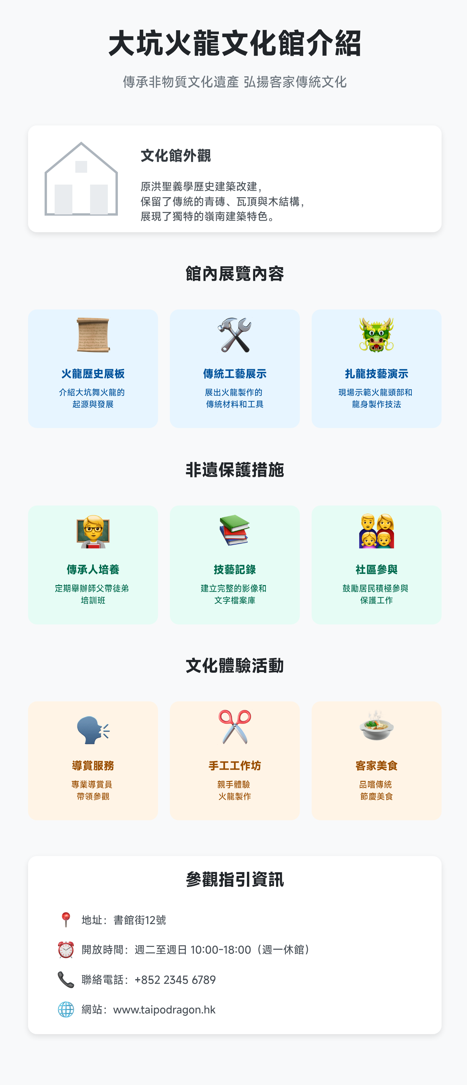在現代都市中,這樣的社區傳統越來越珍貴。它不僅保存了客家文化的精華,更展現了香港多元文化的包容性。政府專門將一座百年歷史建築——原洪聖義學改建為「大坑火龍文化館」,讓這項非遺有了固定的傳承基地,既保護了歷史建築,也為文化傳承提供了永久平台。