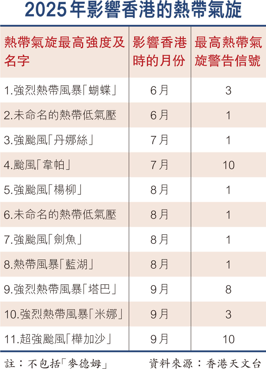 天文台在天氣隨筆「破紀錄的2025年風季」文中表示,今年截至10月3日,共有27個熱帶氣旋影響西北太平洋及南海,當中有12個引致香港天文台需要發出熱帶氣旋警告信號(包括「麥德姆」),打破1946年以來年內「掛波」次數的最高紀錄。今年影響香港的熱帶氣旋數目較正常偏多的主要成因可歸納為兩方面,包括海洋條件:今年6月至9月期間西太平洋海面溫度較正常偏高。尤其是西太平洋暖水區面積較大,廣闊的暖水區提供充足的熱能及較高的大氣不穩定度,促進積雲對流發展,有利熱帶氣旋形成。