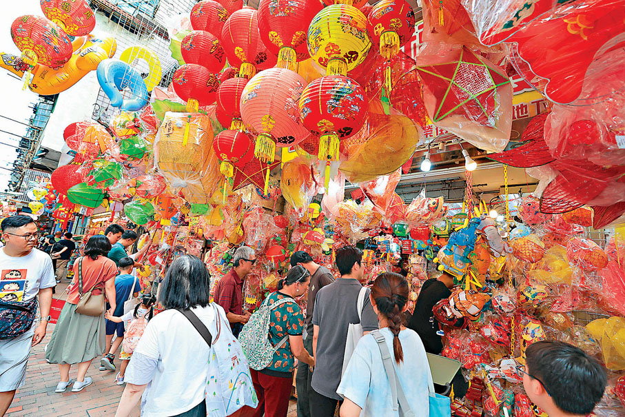 燈籠市場同樣熱鬧。深水埗福榮街兩旁掛滿各式燈籠,傳統手紮款與現代電子款並存。屹立逾一甲子的同安衣紙舖堅持手工製作兔仔、玻璃紙楊桃及印花金魚等傳統燈籠,價格由68港元至428港元不等,店員吳太透露,在農曆七月十四後推出燈籠,不足一月已售罄,反映傳統工藝的獨特魅力。