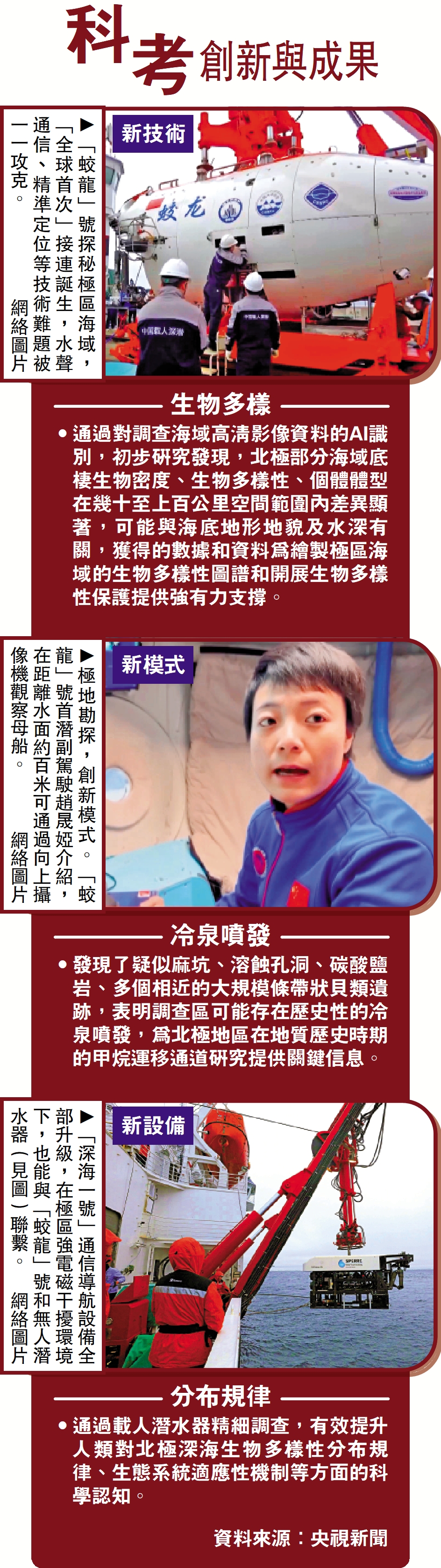 在「雪龍2」號船保障支持下,「深海一號」船搭載「蛟龍」號實現我國首次載人深潛北極冰區下潛,完成10餘次載人深潛,並首次實現雙潛器─「蛟龍」號載人潛水器和ROV(無人遙控潛水器)在北極海域水下協同作業:後者變身「超級助手」,拍攝「蛟龍」號在海底取樣視頻,並協助收集樣本。科考另一突破是用上「AI識別+環境DNA檢測」創新調查模式。此次考察「蛟龍」號大豐收,獲得海鞘、海葵、蛇尾、鈎蝦、海蜘蛛等12大類183件生物樣品。