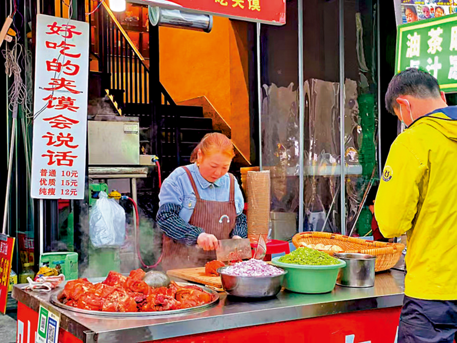 肉夾饃攤前,只見師傅一邊照看着爐子裏正在烤製的燒餅,一邊手法嫻熟地將外酥裏嫩的白吉饃對半切開,再夾上剁碎的臘汁肉,完了還不忘澆上一勺靈魂肉汁。那邊賣甑糕的師傅不停用鏟子刮着鍋沿,白色的糯米疊加着紅色的棗泥,混合着熱氣,散發出甜蜜的香氣。此外,還有西安本地人最愛的麻辣鮮香的肉丸胡辣湯、熱乎的油茶麻花、放入油潑辣子的豆腐腦、表皮香酥的菜盒等等。