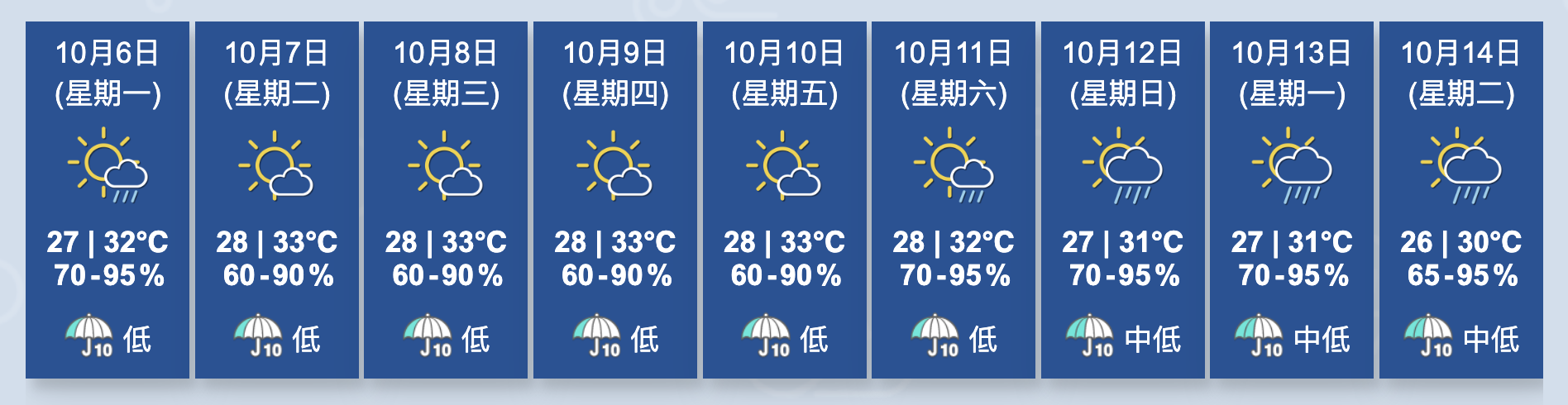 天文台預計,本港中秋節天色好轉,但仍有一兩陣驟雨,早晚部分時間多雲,不過仍有機會見到月光。另外,高空反氣旋會在本周中至後期為華南帶來大致晴朗的天氣,中秋節翌日至星期五本港天氣酷熱。