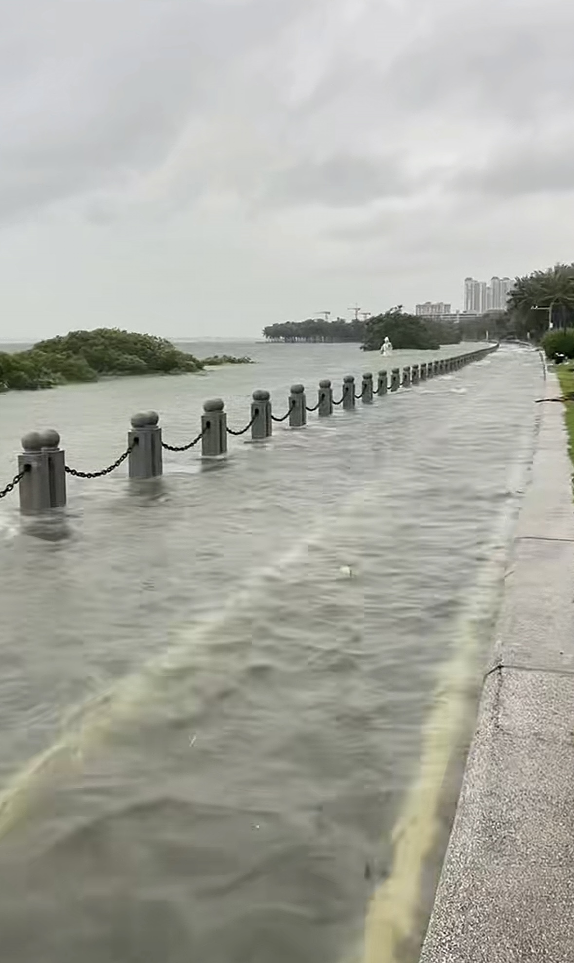 5日上午開始,湛江沿海浪高風急、暴雨傾盆。颱風登陸後,位於沿海的湛江吳川市覃巴鎮梅樓村、大山江街道良美村發生海水倒灌,洶湧的海水湧上岸堤,岸邊不少建築物都出現了水浸。記者從不少網友分享的視頻看到,颱風帶來的暴風雨非常猛烈,斜射的暴雨形成白茫茫的雨霧,棕櫚樹和樹木幾乎被吹彎了一半。有高層住宅的圍欄、窗戶被吹飛,不少民眾家中的窗戶還被吹爆,狂風雨不斷被灌進來。不少酒店樓下的停車區車輛也被淹沒了一半。