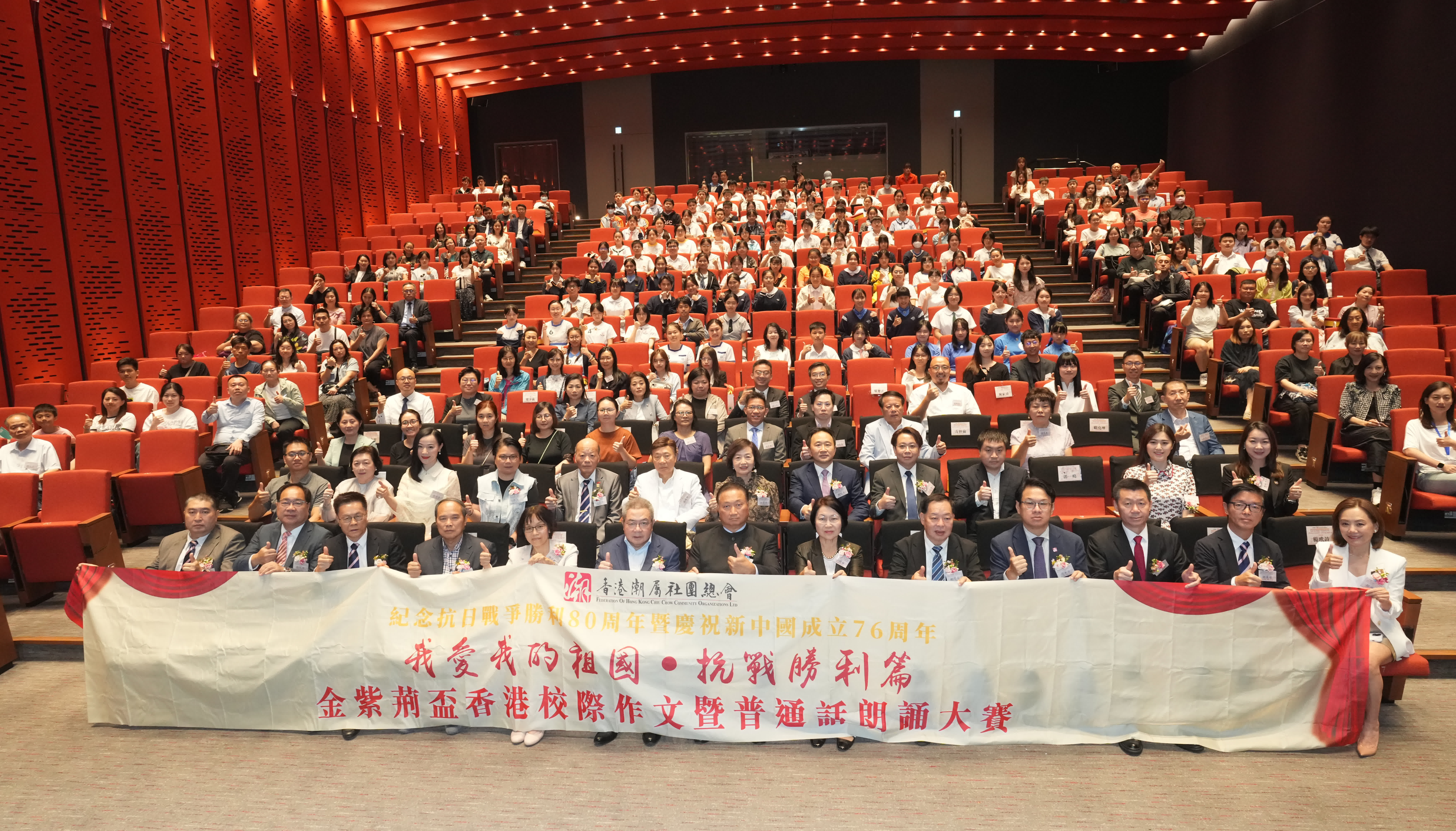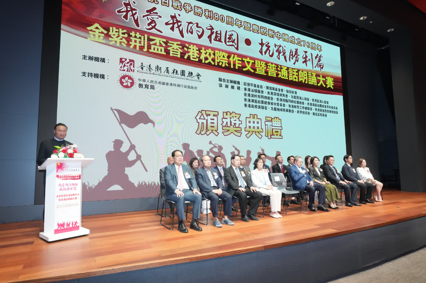 香港潮屬社團總會主席陳振彬在頒獎典禮致辭時指出,80年前,無數中華兒女以鮮血築起抵禦外侮的長城,其中以莊世平先生為代表的潮籍先賢,更是積極投身救國洪流,用行動書寫了抗戰史冊的光輝一頁。「香港潮屬社團總會長期以『團結潮人、扎根香港、凝聚力量、攜手並進』為宗旨,此次聯合多方主辦大賽,正是希望延續先輩精神,讓青少年在創作與朗誦中銘記歷史。」他特別鼓勵參賽學生:「希望你們以普通話為橋樑,打通與祖國內地的文化溝通之路,主動講好中國故事、香港故事,讓愛國愛港的情懷在新一代中紮根生長。」