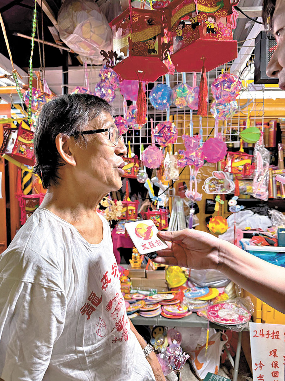 節日用品檔主黃先生則表示生意未有因到場觀賞人數眾多而得益,今年營業額更較以往減少,但表示每年進貨並非為賺錢,而是希望將傳統文化傳承下去,「如果為了賺錢,也不會擺在這裏,燈油火蠟都需要不少錢,主要還是為了讓街坊開心。」