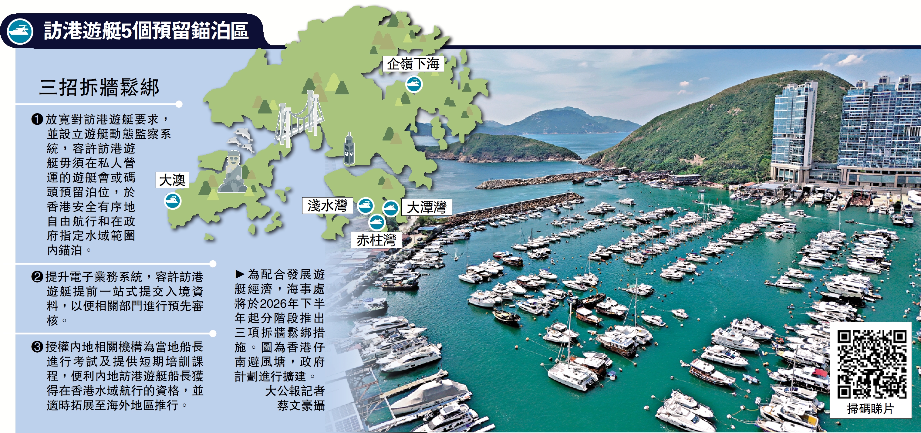 落實拆牆鬆綁措施後,訪港遊艇毋須在遊艇會或碼頭預留泊位,亦可在香港自由航行及在政府指定水域停泊。王世發表示,海事處已預留了五個地方作為遊艇錨泊區,分別是赤柱灣、大潭灣、淺水灣、大澳和企嶺下海。若以40米長的遊艇為例,該五個灣區共可停泊約110艘遊艇。