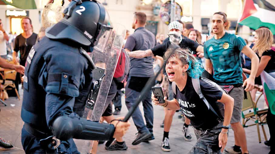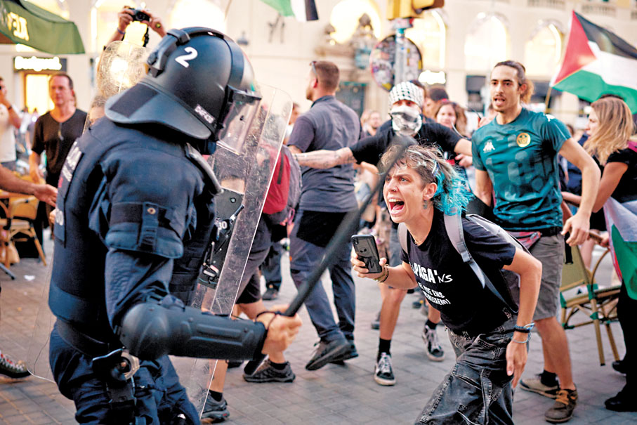 西班牙全國也有多座城市爆發示威,抗議以軍在加沙的軍事行動,首都馬德里的遊行人數高達10萬人,另一座主要城市巴塞羅那也有約7萬人參與,多地示威遊行均和平結束,部分地區有數百人與警方爆發衝突,警方施放催淚煙驅散人群,部分與以色列相關商舖遭人破壞。巴塞羅那警方表示有8人被捕,20名警察受傷。