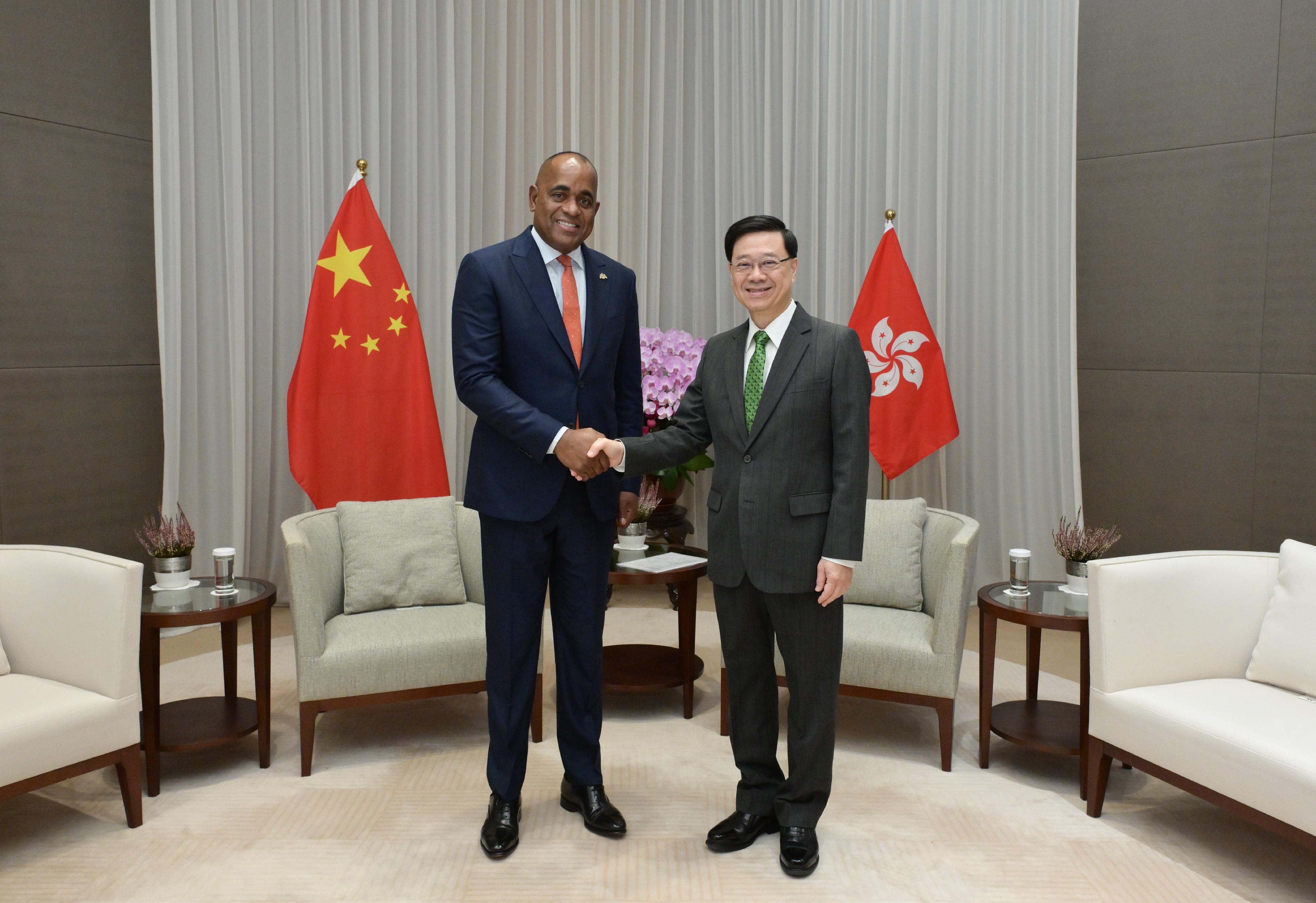 大公文匯全媒體報道,行政長官李家超今日(6日)與多米尼克總理羅斯福·斯凱里特會面,就共同關注的議題交流意見。商務及經濟發展局局長丘應樺亦有出席。