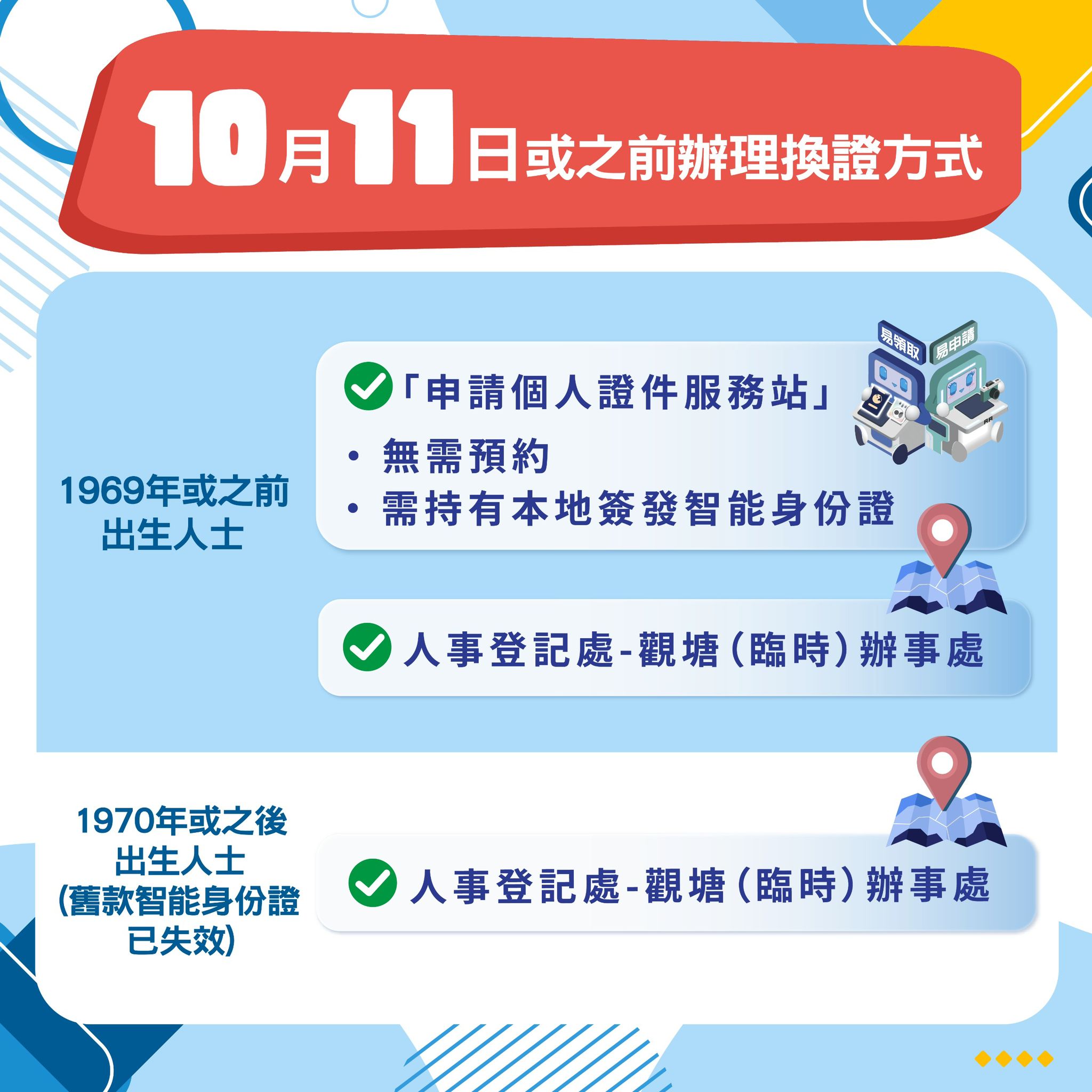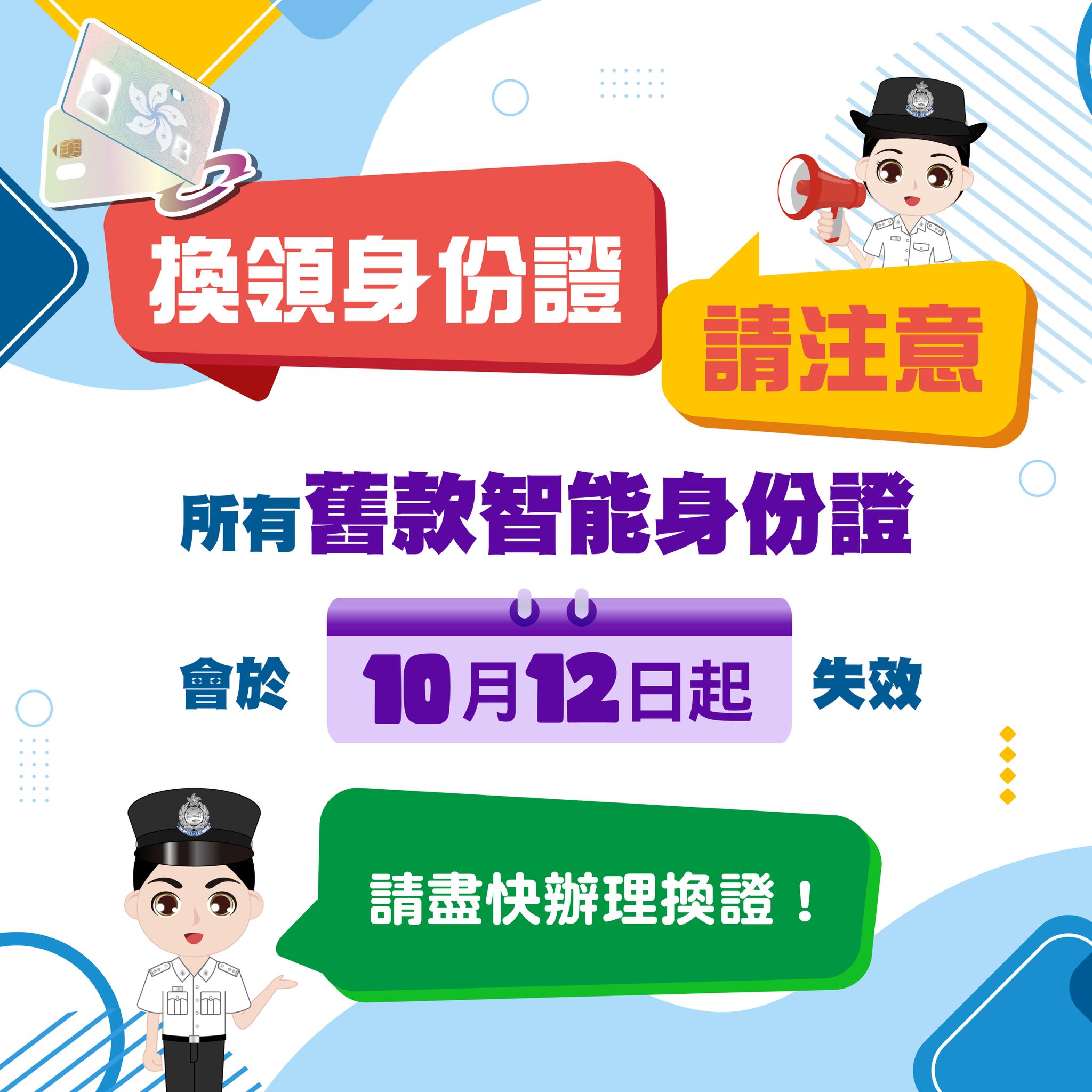 繼1970年或之後出生人士的舊款智能身份證已經失效,1969年或之前出生人士的舊款智能身份證也將會在10月12日起失效。