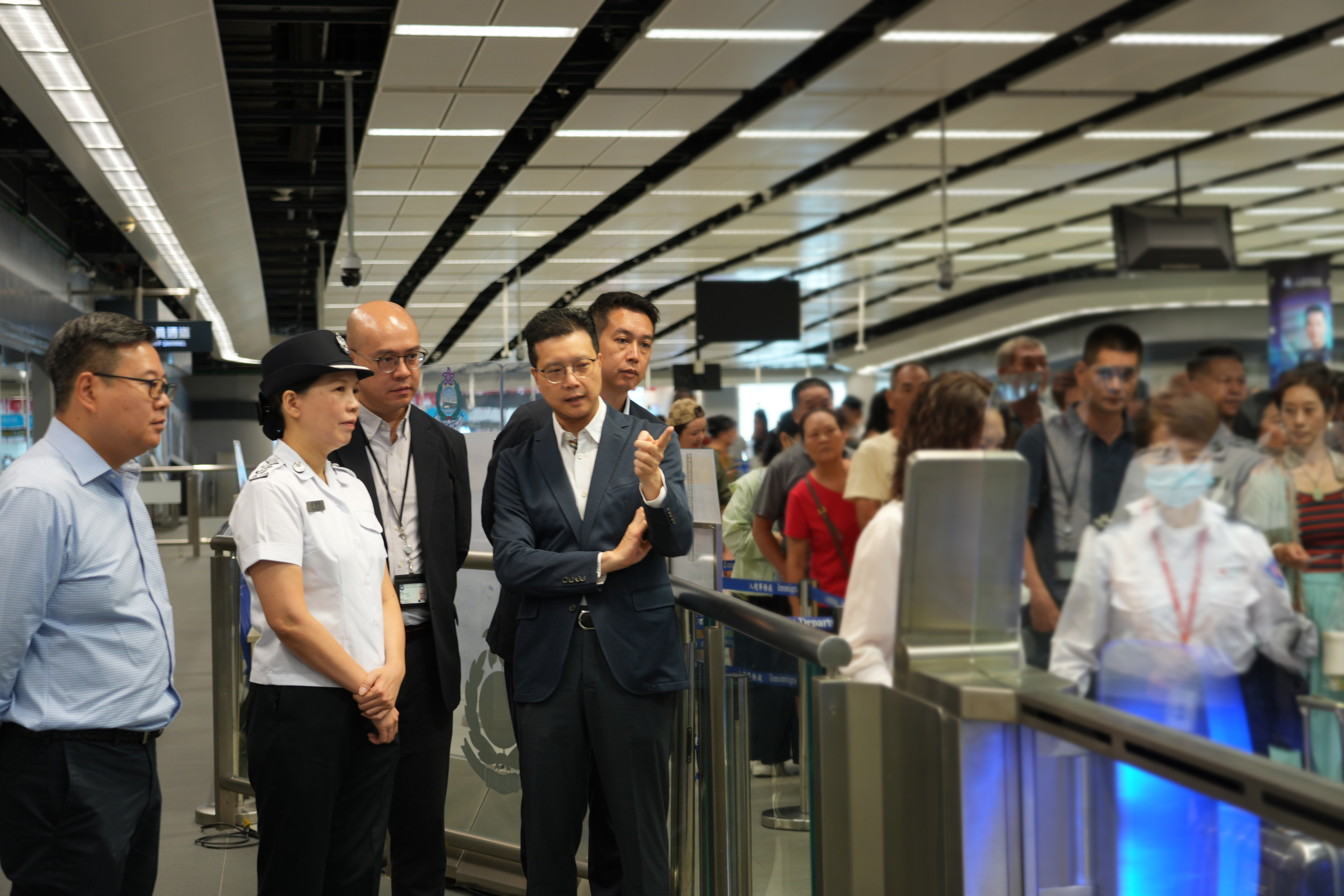副處長(管制、簽證及證件)程和木及助理處長(管制) 樊曉聲於上星期到香園圍、落馬洲支線和深圳灣管制站視察各個管制站在國慶黃金周首天的運作,同時為管制站人員打氣。國慶黃金周首天管制站運作暢順,我們入境處同事會繼續堅守崗位,全力以赴,在旅客流量高峰期間維持各管制站運作暢順有序,歡迎更多的旅客來香港旅遊。