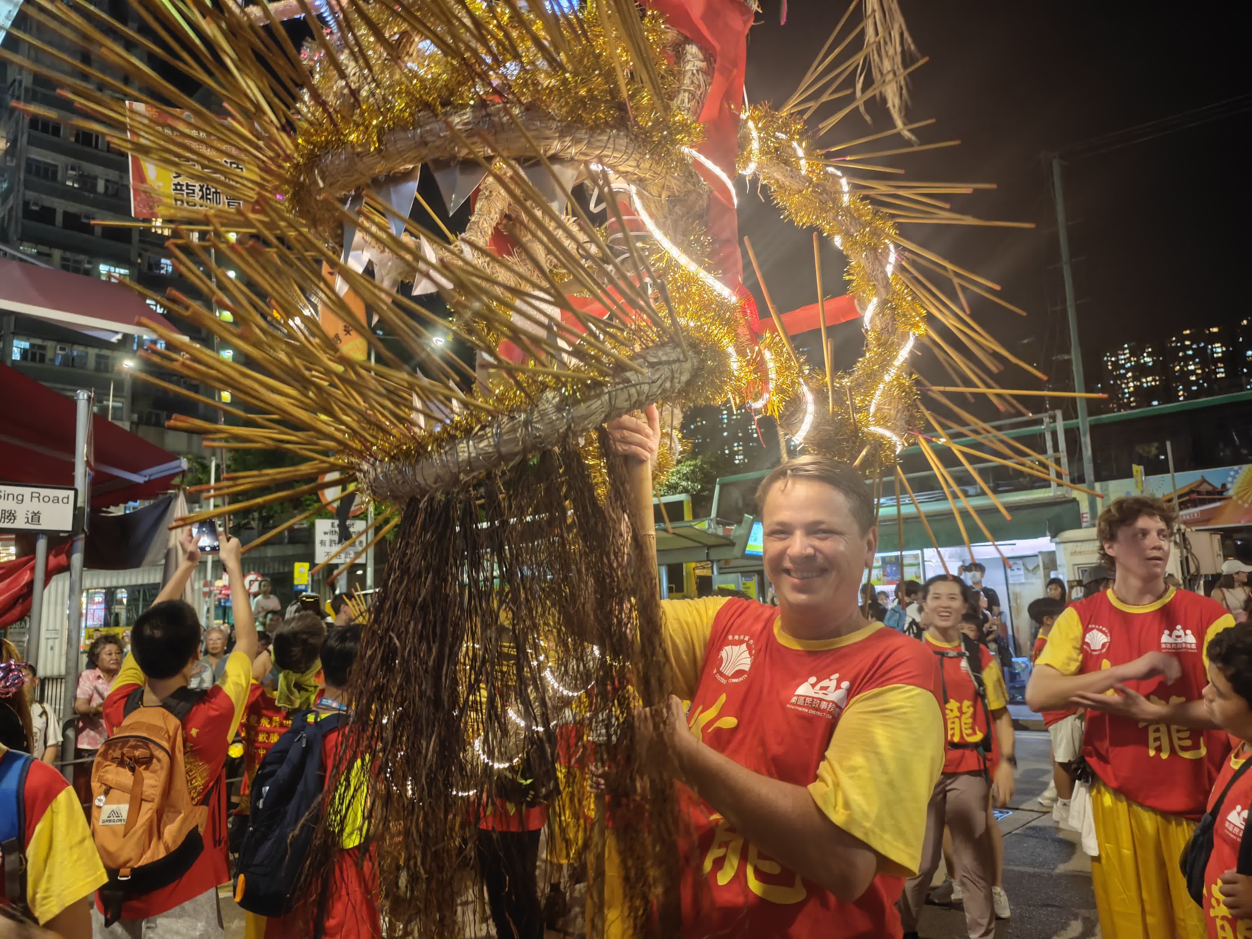 住在南丫島、在香港出身長大46年的James告訴記者,他對舞火龍已不陌生,但真正抓着龍頭帶領隊伍前進還是第一次。他女兒本次是舞龍隊一員,他也因此幸運加入舞龍隊。他激動表示,舞龍感覺十分奇妙,火龍頭很重,尤其是走到別人面前,他們想觸摸火龍的時候,有「神聖感」,覺得自己「責任重大」。