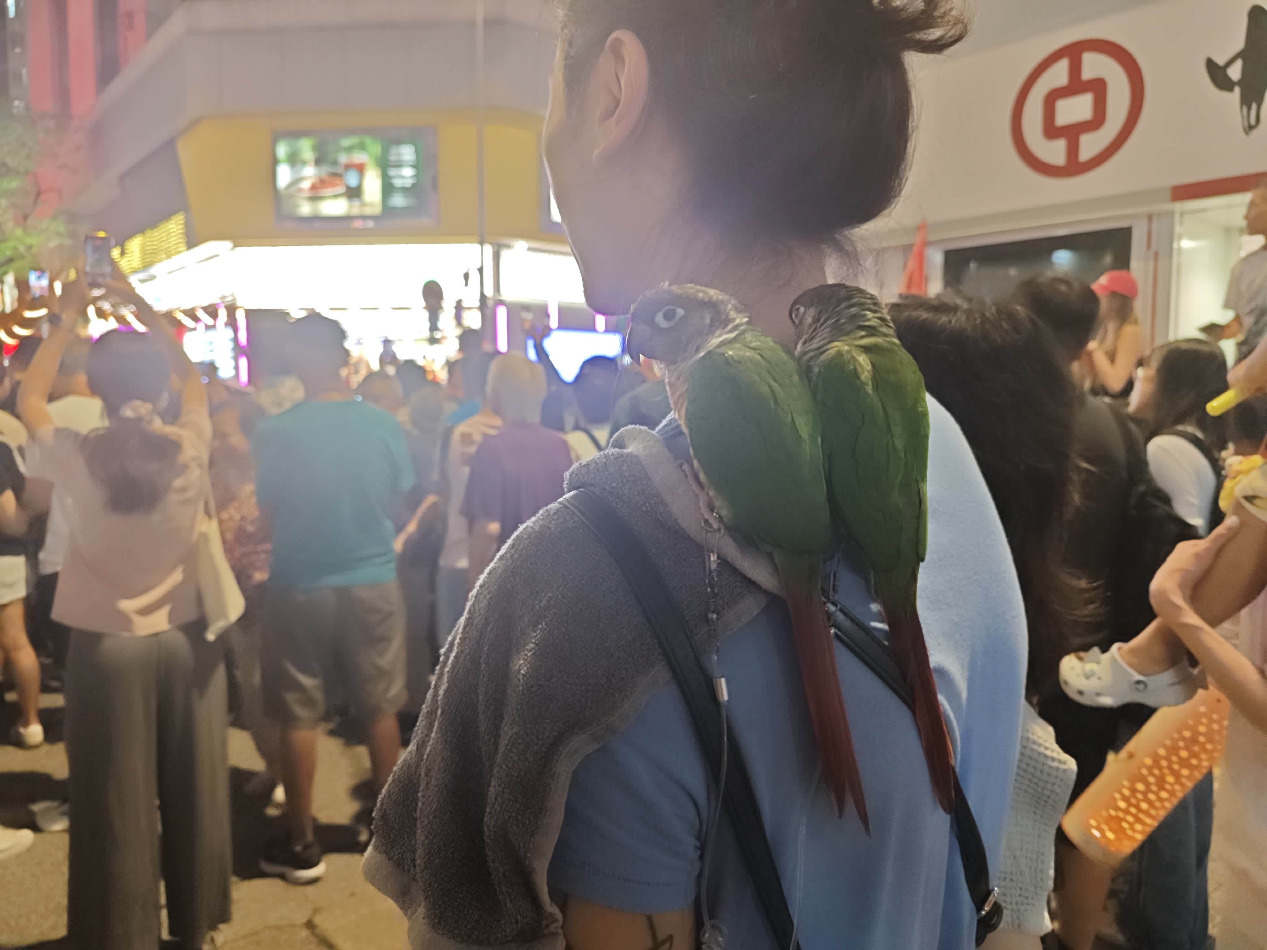 市民張先生本次帶着家養的兩隻鸚鵡來看舞龍。他表示,自己住在九龍,平日少來港島,舞火龍更是從未見過,今次特地來到香港仔觀賞,讚演出精彩,現場十分熱鬧。他指自己平日出行都會帶上鸚鵡,笑着說,舞火龍已有百年歷史,本次也想帶着它們了解一下香港的傳統文化。