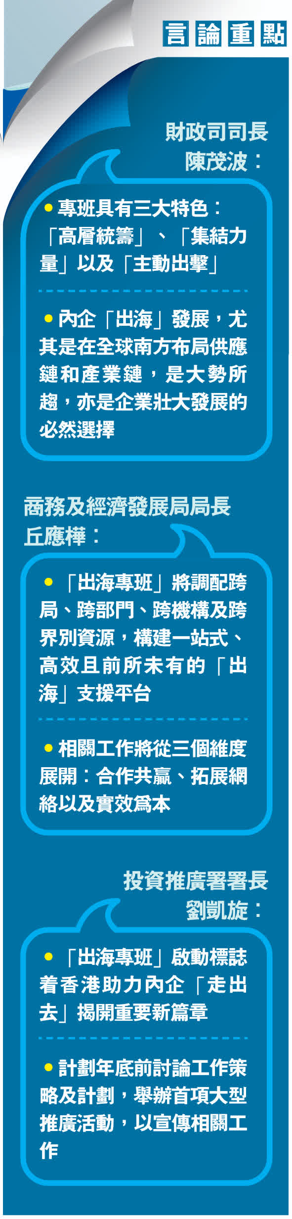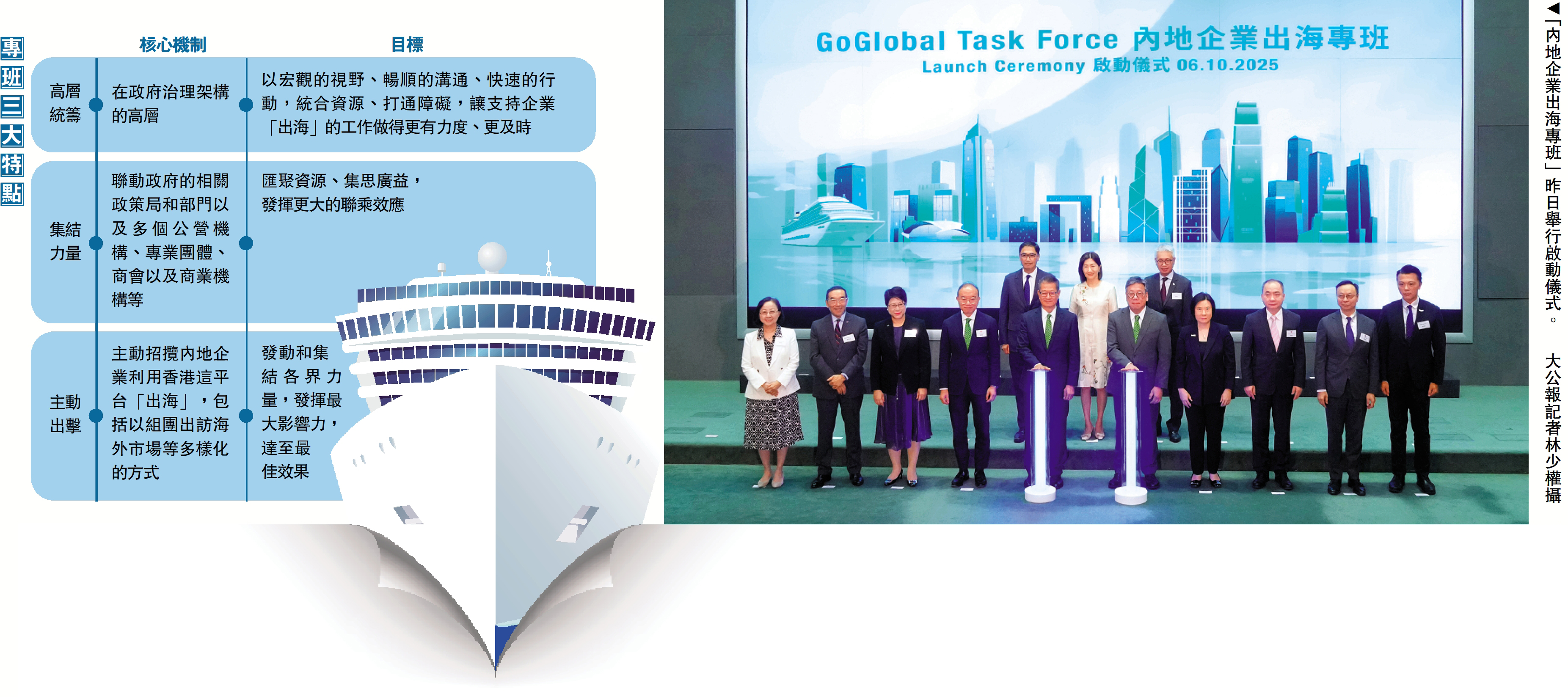 (大公報記者 李樂兒)特區政府新成立的「內地企業出海專班」昨日正式啟動,財政司司長陳茂波表示,專班具有三大特色:「高層統籌」確保資源整合、打通障礙;利用「集結力量」,統籌政商、專業團體等界別力量形成聯乘效應;採取「主動出擊」策略,通過招攬企業和組團出訪開拓海外市場。負責督導該專班的商經局局長丘應樺表示,希望透過這個平台,匯聚各方專業力量,讓內地企業有序走向世界,同時能轉化為香港經濟的新動能,進一步鞏固國際商貿樞紐的地位。
