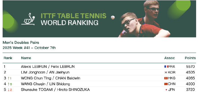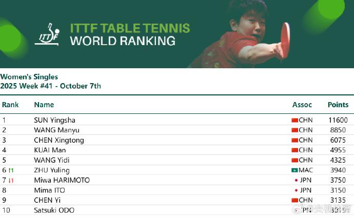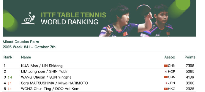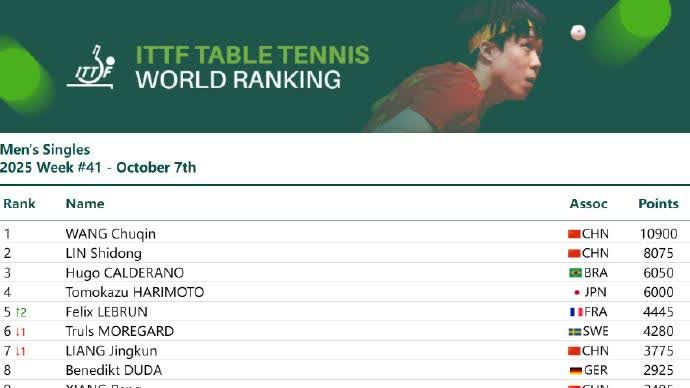 大公文匯全媒體報道,今天(7日),國際乒聯公布2025年第41周世界排名。男單方面,王楚欽憑藉在WTT中國大滿貫中奪冠,世界排名積分從9425分躍升至10900分;女單方面,「萬分女王」孫穎莎繼續領跑世界排名,連續169周排名第一;雙打方面,蒯曼/林詩棟混雙排名第一,王楚欽/孫穎莎排名升至第三,王楚欽/林詩棟男雙世界排名第四。