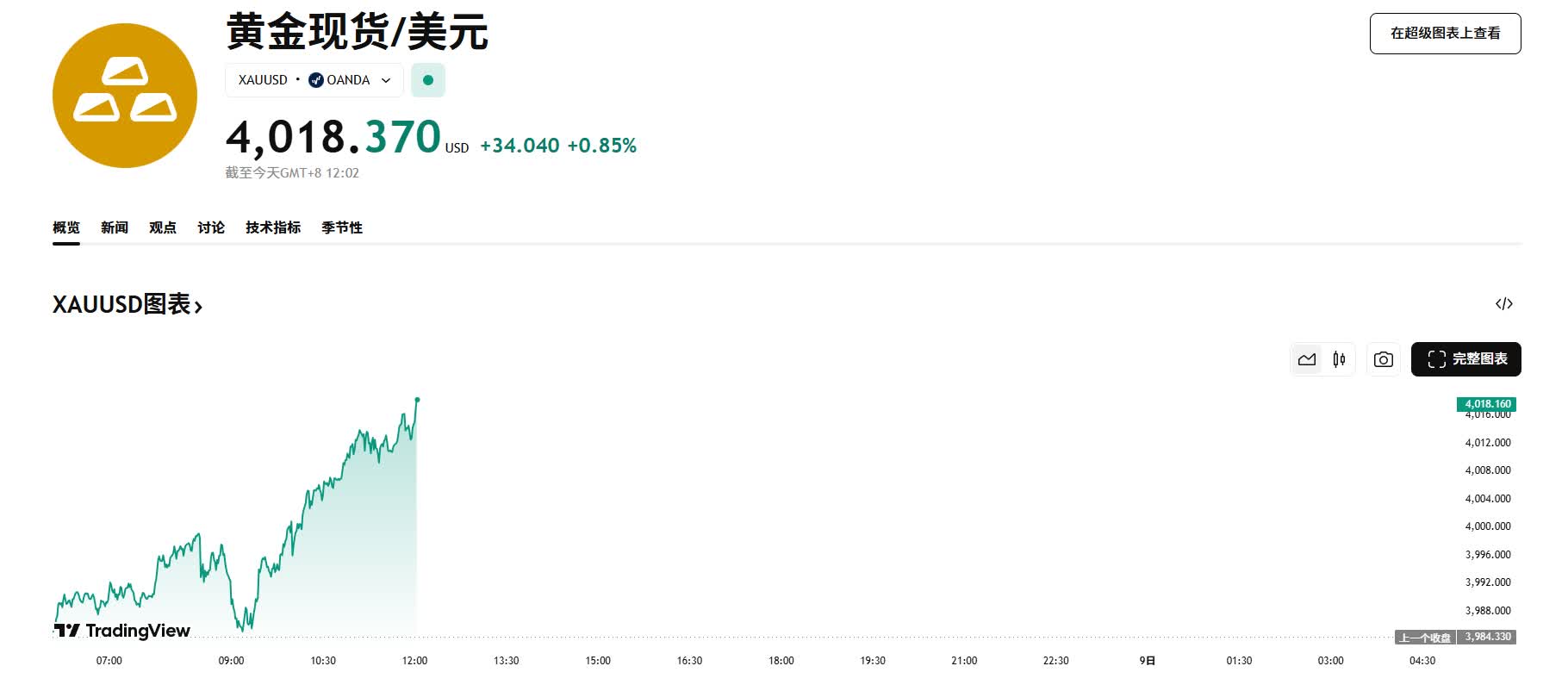 大公文匯網報道,10月8日,現貨黃金突破4000美元/盎司,續創歷史新高,年內漲幅超52%。截至發稿,報4018美元/盎司。