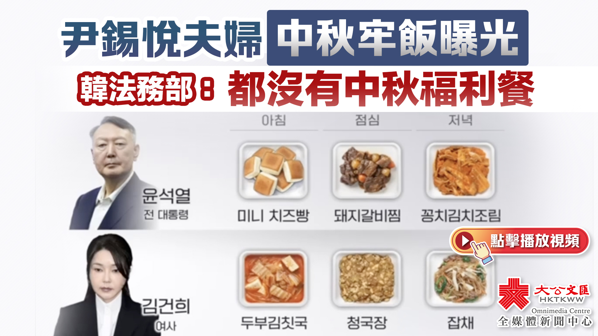 大公文匯全媒體報道,據韓媒10月6日報道,韓國前總統尹錫悅和夫人金建希,分別在首爾拘留所與首爾南部拘留所中,度過了中秋節。由於韓國法務部預算緊張,今年兩人所在的拘留所,都沒有中秋福利餐。中秋當天的菜單,和平時差不多。另外,兩人還可以在牢房裏收看4個電視頻道。