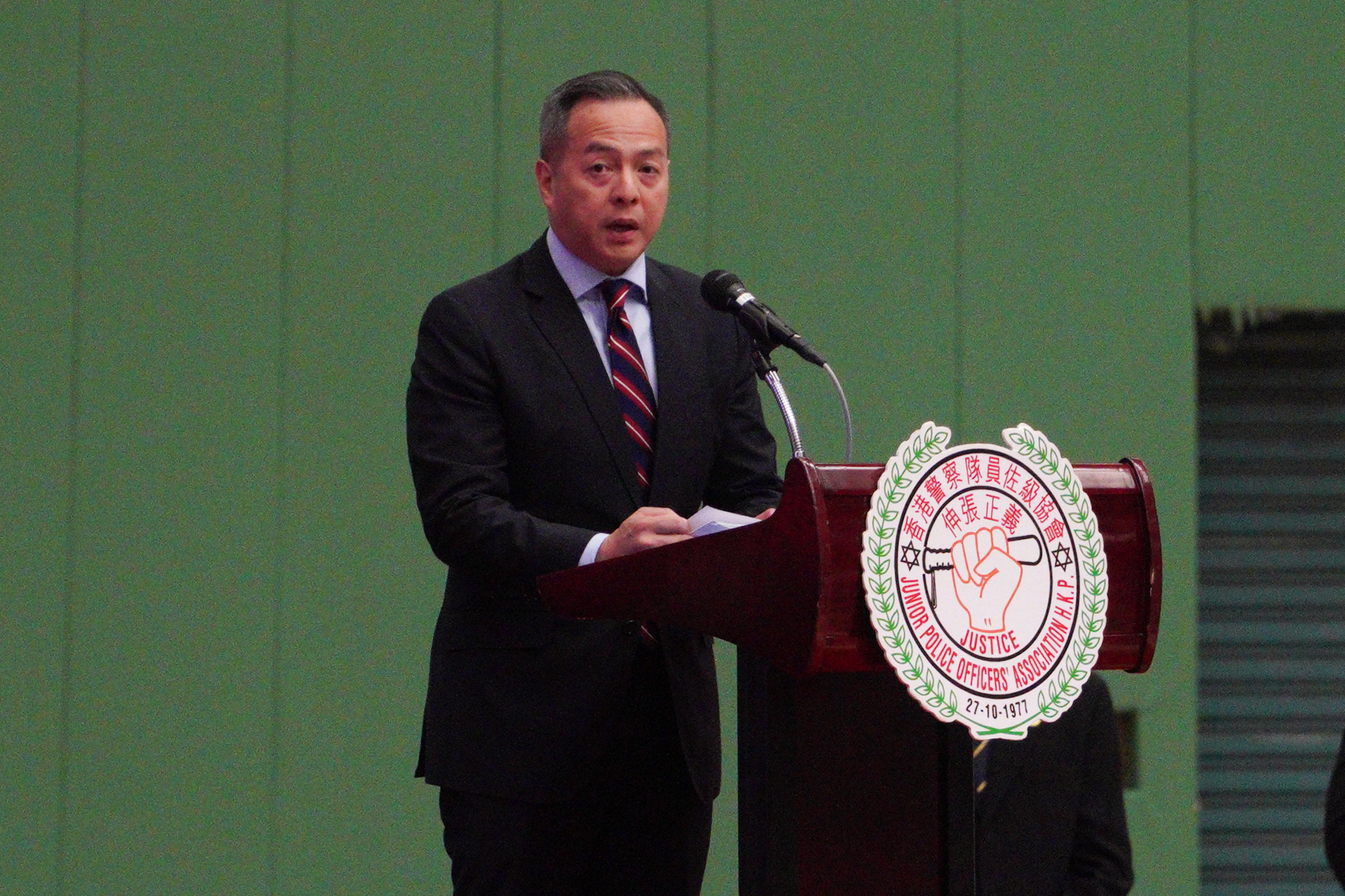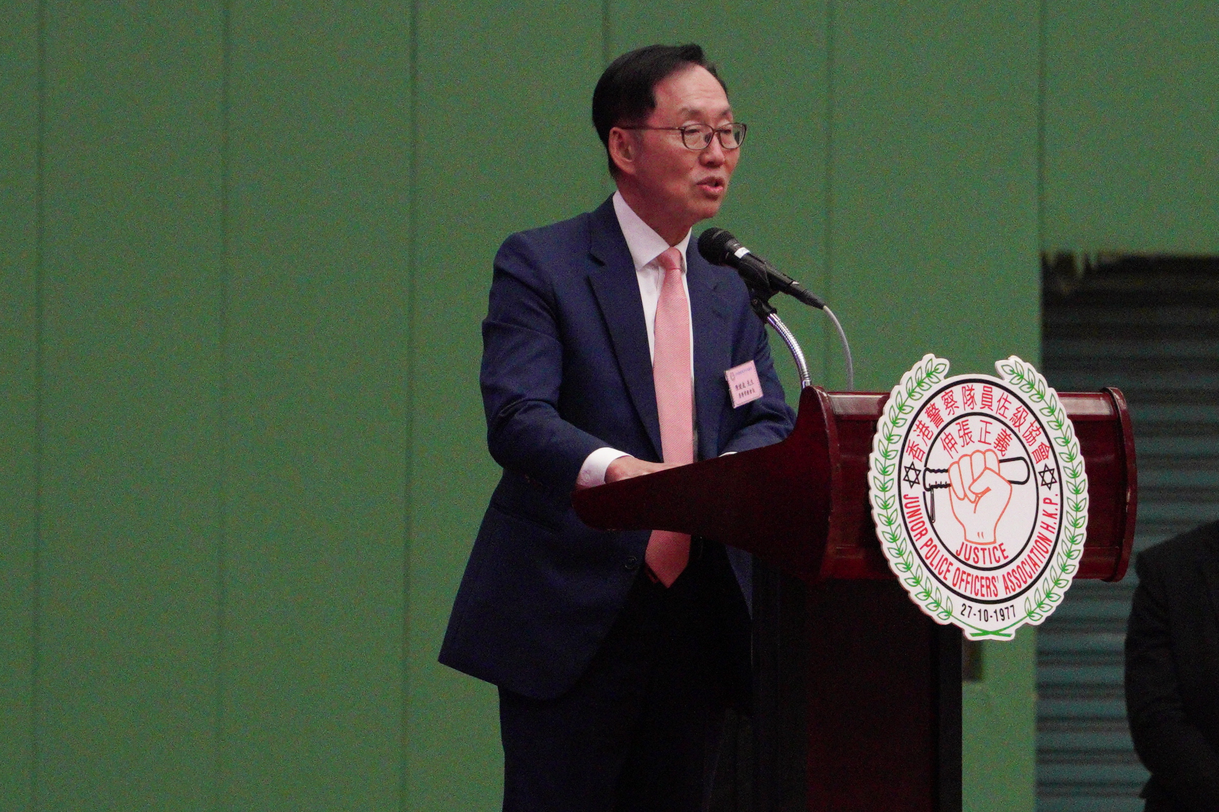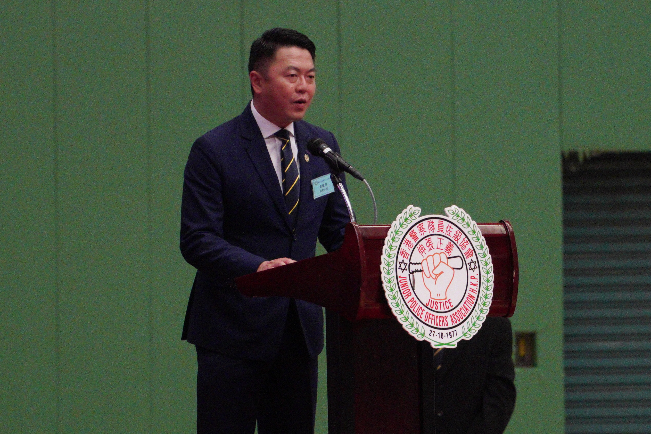 梁俊傑首先為酒會致辭,他以「4支樁柱,8個台階」闡述協會48周年所蘊含的特別意義,並希望協會未來為警隊、市民、社會及國家繼續服務。他指出,已為2028年的職系教學檢討做好準備,希望能為新制同事爭取退休後的醫療保障和子女的教育津貼、改善服務條件等,希望藉此吸引有志之士投考警隊,同時挽留人才。