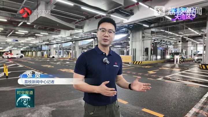 荔枝新聞中心記者張賀說:「我現在在港珠澳大橋珠海公路口岸入境客車通道,我身旁,一輛輛港澳單牌車正有序通過全國海關首個客貨車『一站式』系統,這個系統可以實現通關車輛『一次讀取,分別處置,一次抬桿,高效驗放』。」